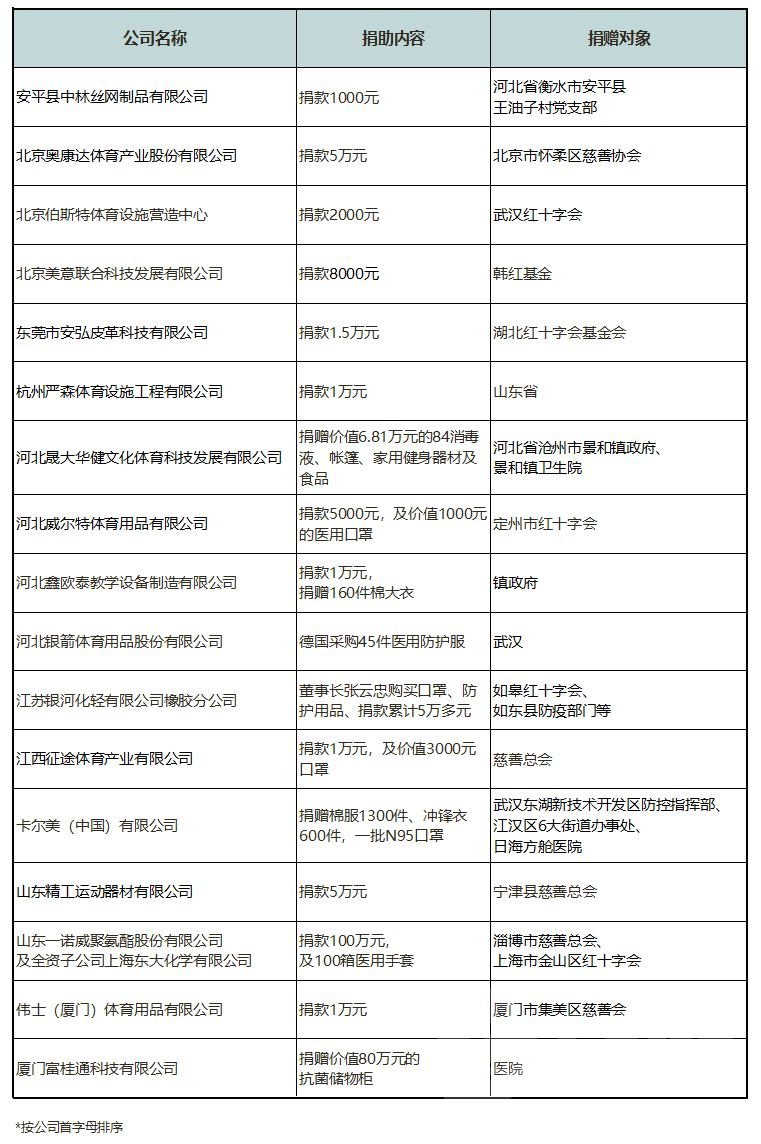 面对抗击疫情的严峻形势,山东精工运动器材有限公司通过宁津县慈善总会向疫区捐款5万元,广东省东莞市安弘皮革科技有限公司通过湖北省红十字会基金会捐款1.5万元,杭州严森体育设施工程有限公司向山东疫区捐赠1万元,江西征途体育产业有限公司向疫区捐款1万元及口罩,江苏银河化轻有限公司橡胶分公司捐赠口罩、防护用品、捐款累计5万余元,河北鑫欧泰教学设备制造有限公司捐款1万元及160件棉大衣,伟士(厦门)体育用品有限公司捐款1万元,北京奥康达体育产业股份有限公司通过北京市怀柔区慈善协会捐款5万元支援抗疫。