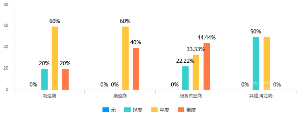 据数据显示,渠道商受影响比例较大,其与服务供应商受重度影响比例均达到40%及以上,同时与制造商受中度影响比例均达到60%。
