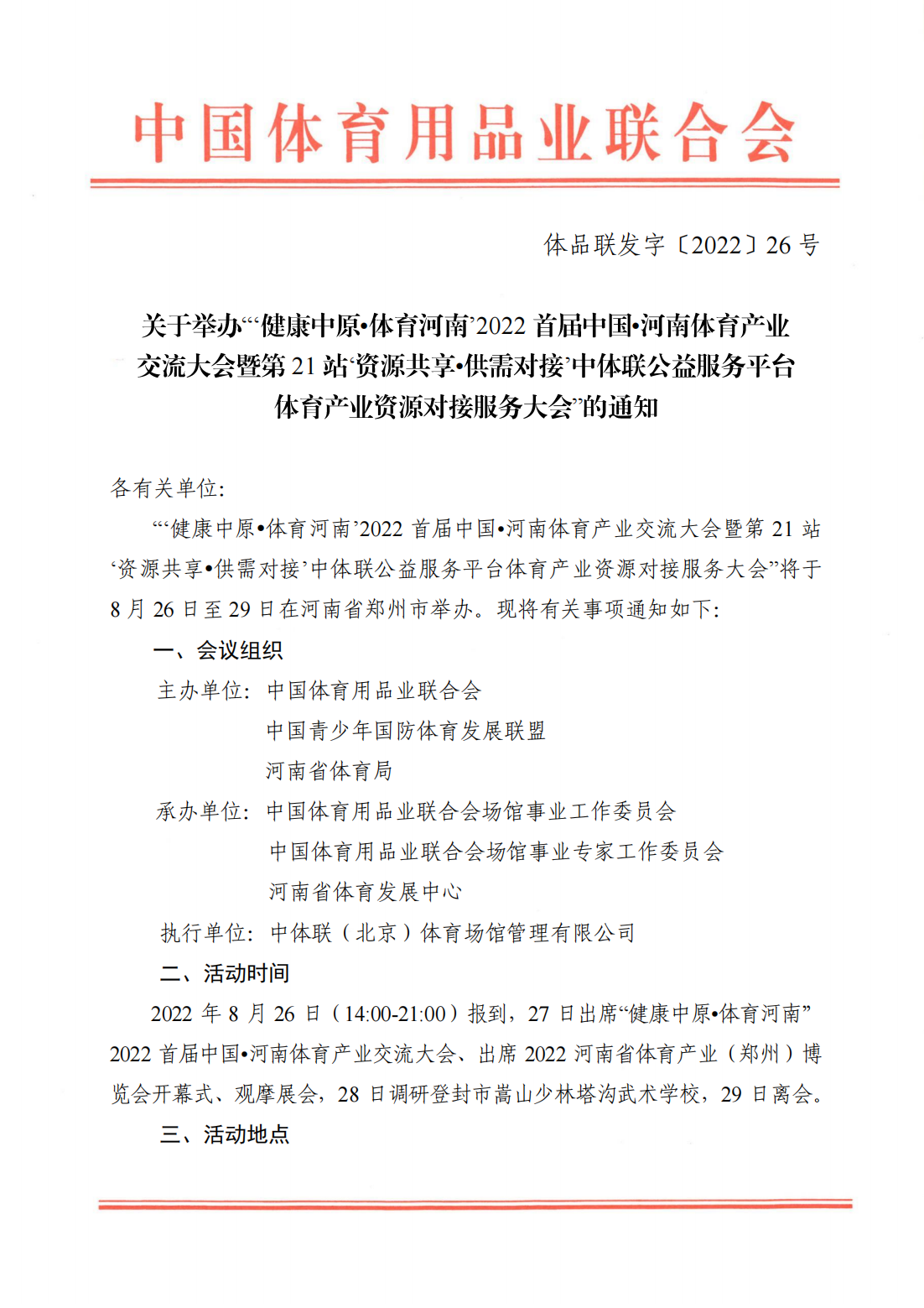 “‘健康中原•体育河南’2022首届中国•河南体育产业交流大会暨第21站‘资源共享•供需对接’中体联公益服务平台体育产业资源对接服务大会”将于8月26日至29日在河南省郑州市举办。现将有关事项通知如下: