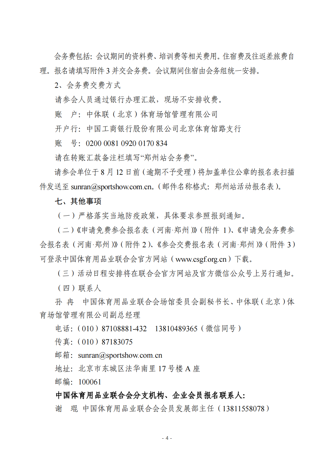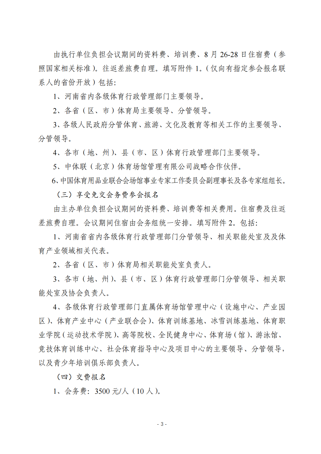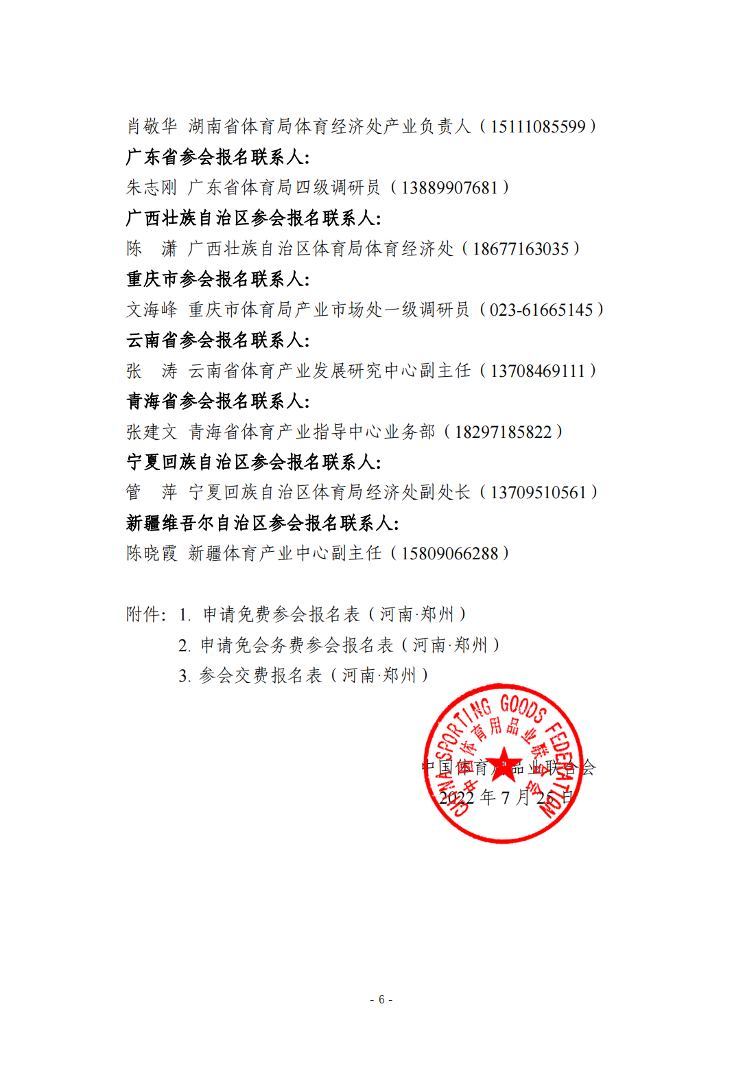 (二)《申请免费参会报名表(河南·郑州)》(附件1)、《申请免会务费参会报名表(河南·郑州)》(附件2)、《参会交费报名表(河南·郑州)》(附件3)可登录中国体育用品业联合会官方网站(www.csgf.org.cn)下载。