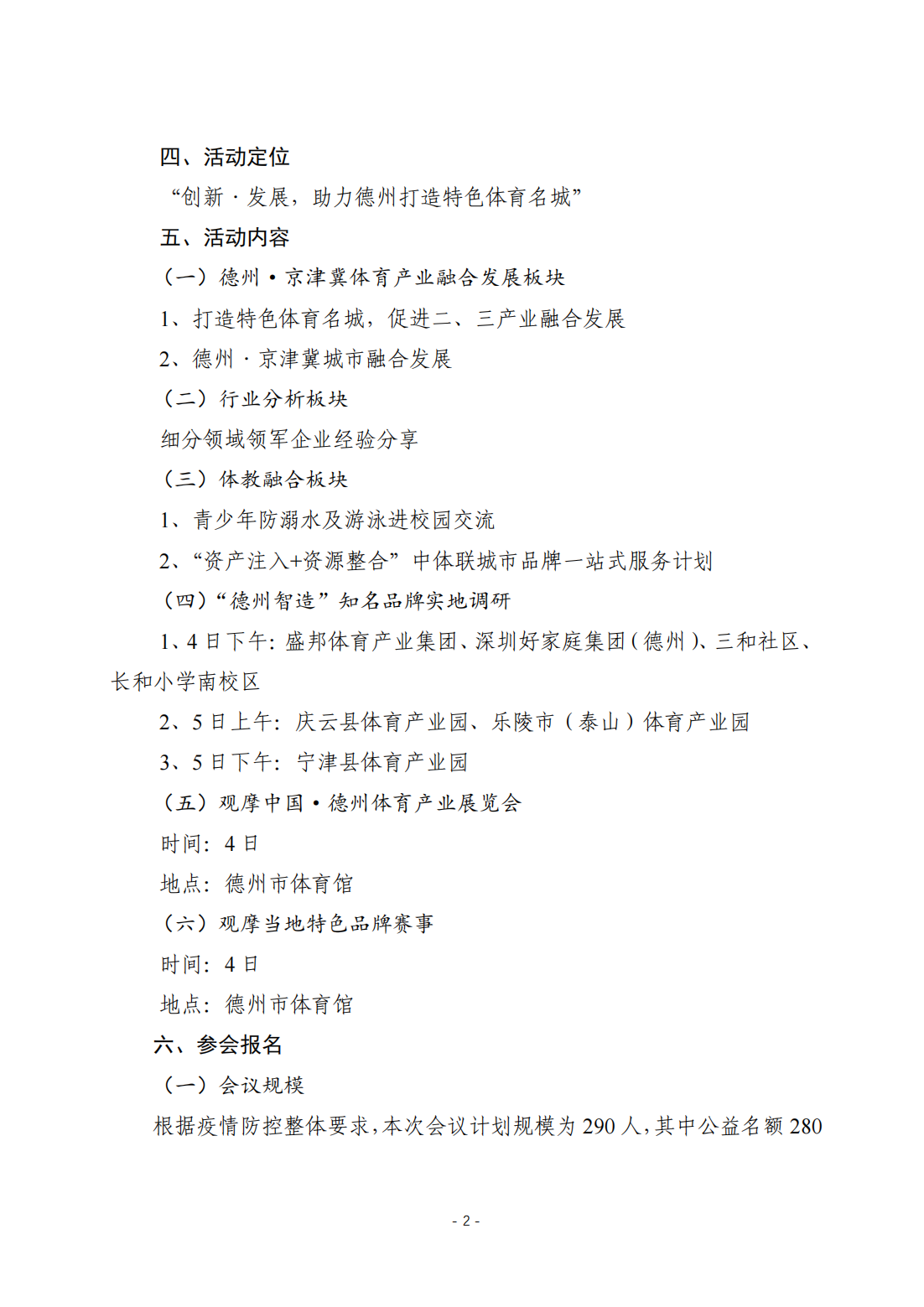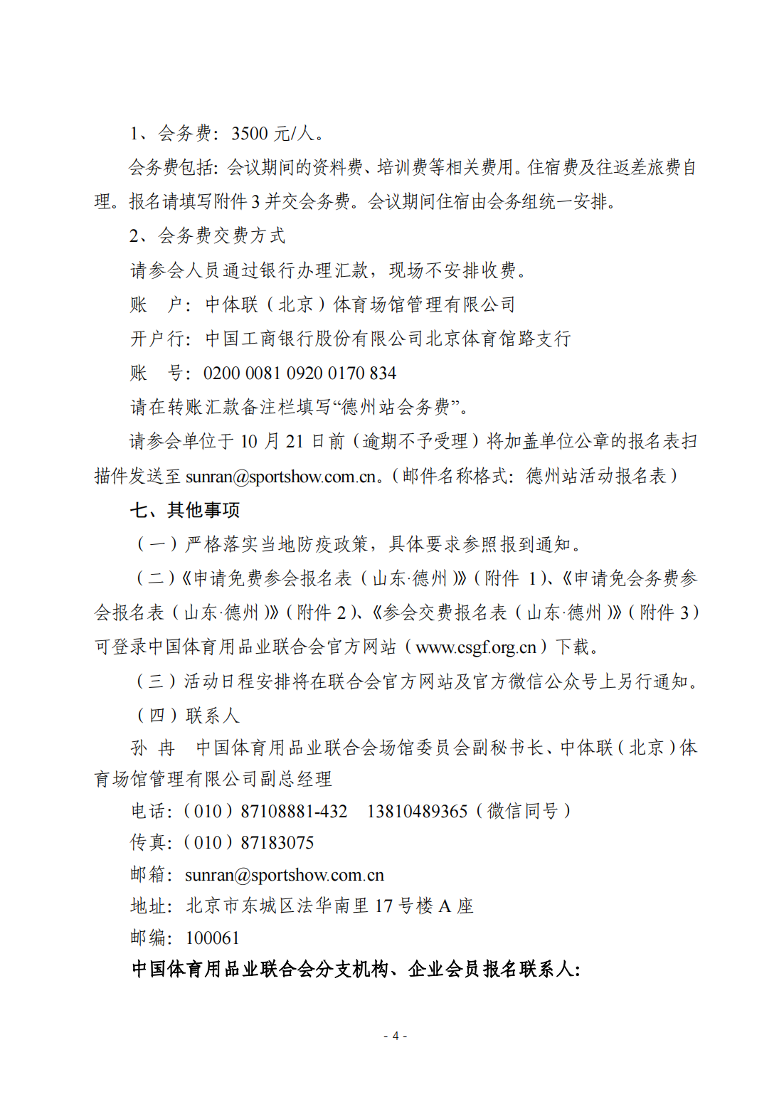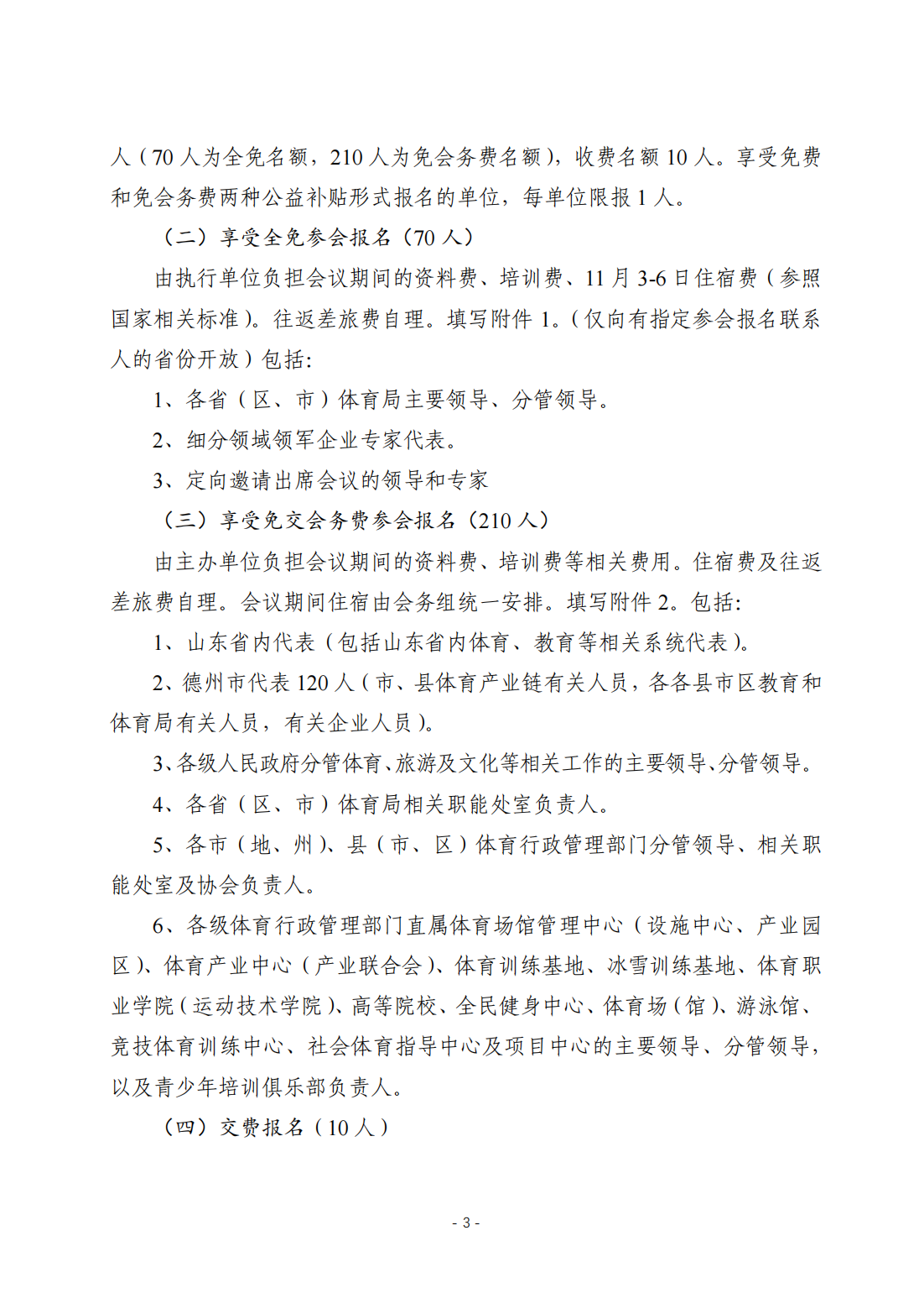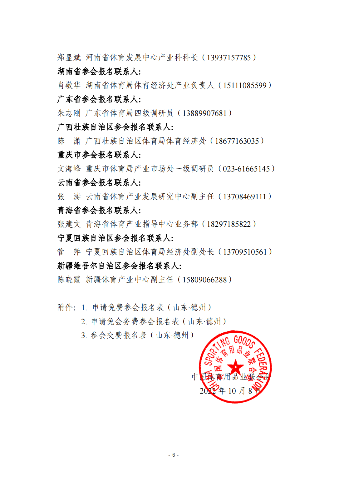 (二)《申请免费参会报名表(山东·德州)》(附件1)、《申请免会务费参会报名表(山东·德州)》(附件2)、《参会交费报名表(山东·德州)》(附件3)可登录中国体育用品业联合会官方网站 (www.csgf.org.cn)下载。