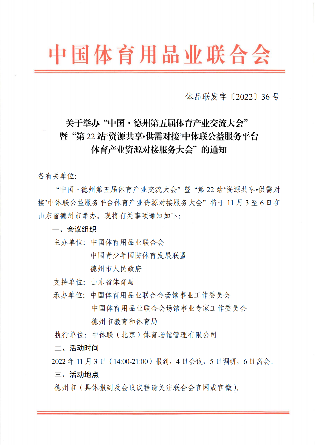 “中国·德州第五届体育产业交流大会”暨“第22站‘资源共享•供需对接’中体联公益服务平台体育产业资源对接服务大会”将于11月3至6日在山东省德州市举办。现将有关事项通知如下: