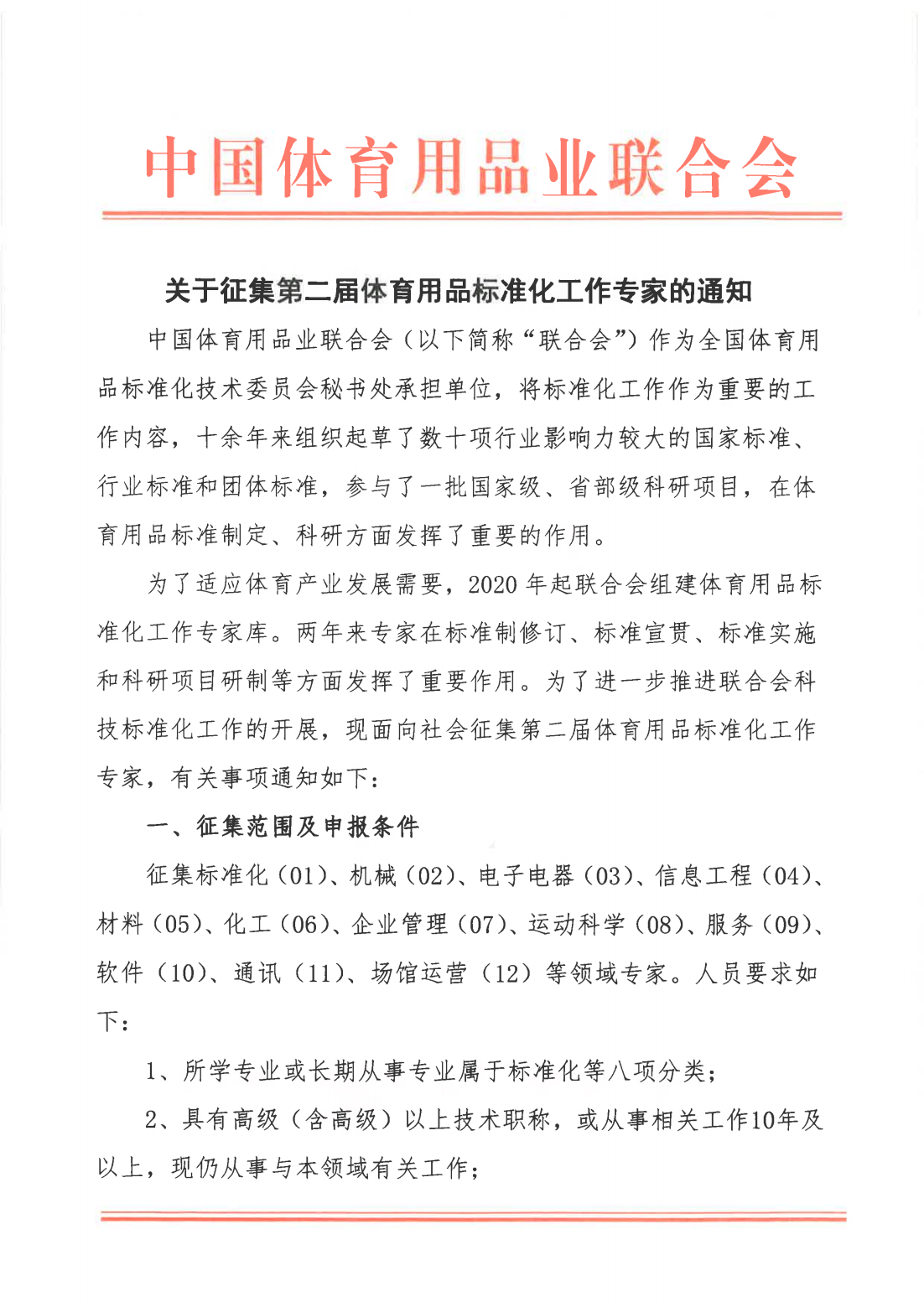 为了适应体育产业发展需要,2020年起联合会组建体育用品标准化工作专家库。两年来专家在标准制修订、标准宣贯、标准实施和科研项目研制等方面发挥了重要作用。为了进一步推进联合会科技标准化工作的开展,现面向社会征集第二届体育用品标准化工作专家,有关事项通知如下: