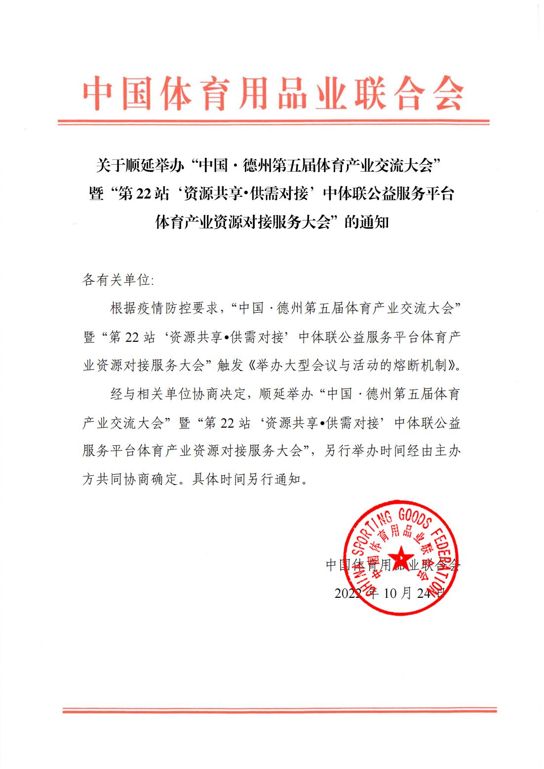 经与相关单位协商决定,顺延举办“中国·德州第五届体育产业交流大会”暨“第22站‘资源共享•供需对接’中体联公益服务平台体育产业资源对接服务大会”,另行举办时间经由主办方共同协商确定。具体时间另行通知。