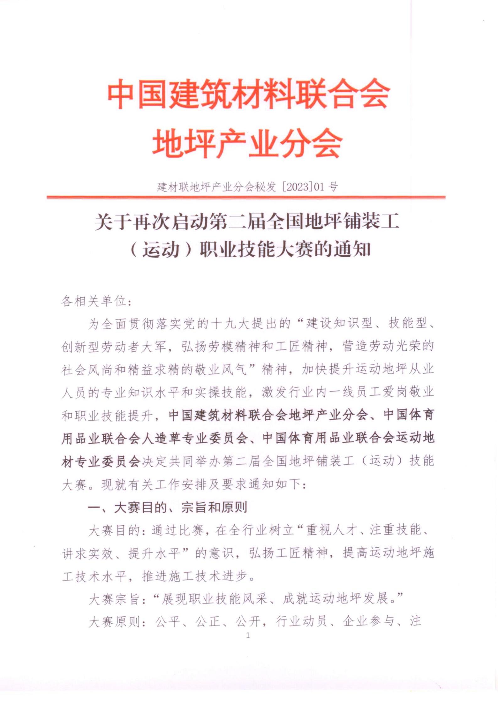 为全面贯彻落实党的十九大提出的“建设知识型、技能型、创新型劳动者大军,弘扬劳模精神和工匠精神,营造劳动光荣的社会风尚和精益求精的敬业风气”精神,加快提升运动地坪从业人员的专业知识水平和实操技能,激发行业内一线员工爱岗敬业和职业技能提升,中国体育用品业联合会人造草专业委员会、中国体育用品业联合会运动地材专业委员会、中国建筑材料联合会地坪产业分会决定共同举办第二届全国地坪铺装工(运动)技能大赛。