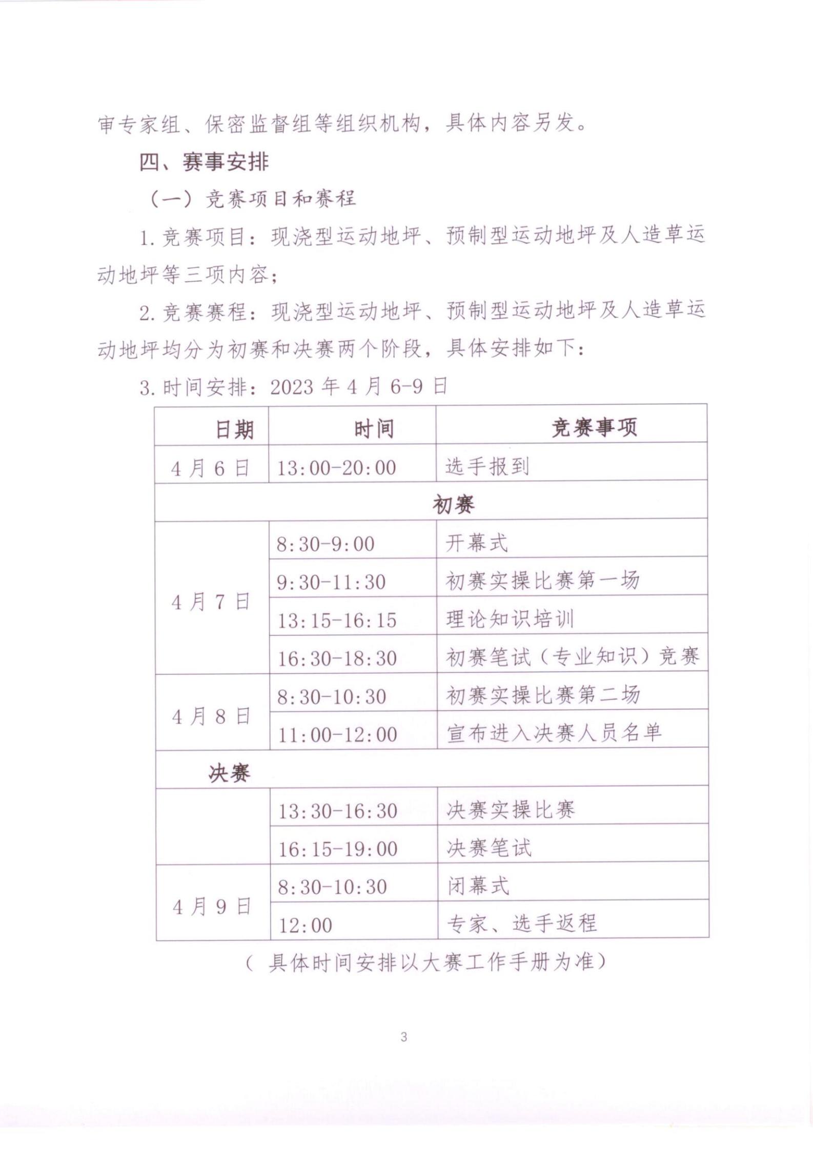 2.竞赛赛程:现浇型运动地坪、预制型运动地坪及人造草运动地坪均分为初赛和决赛两个阶段,具体安排如下: