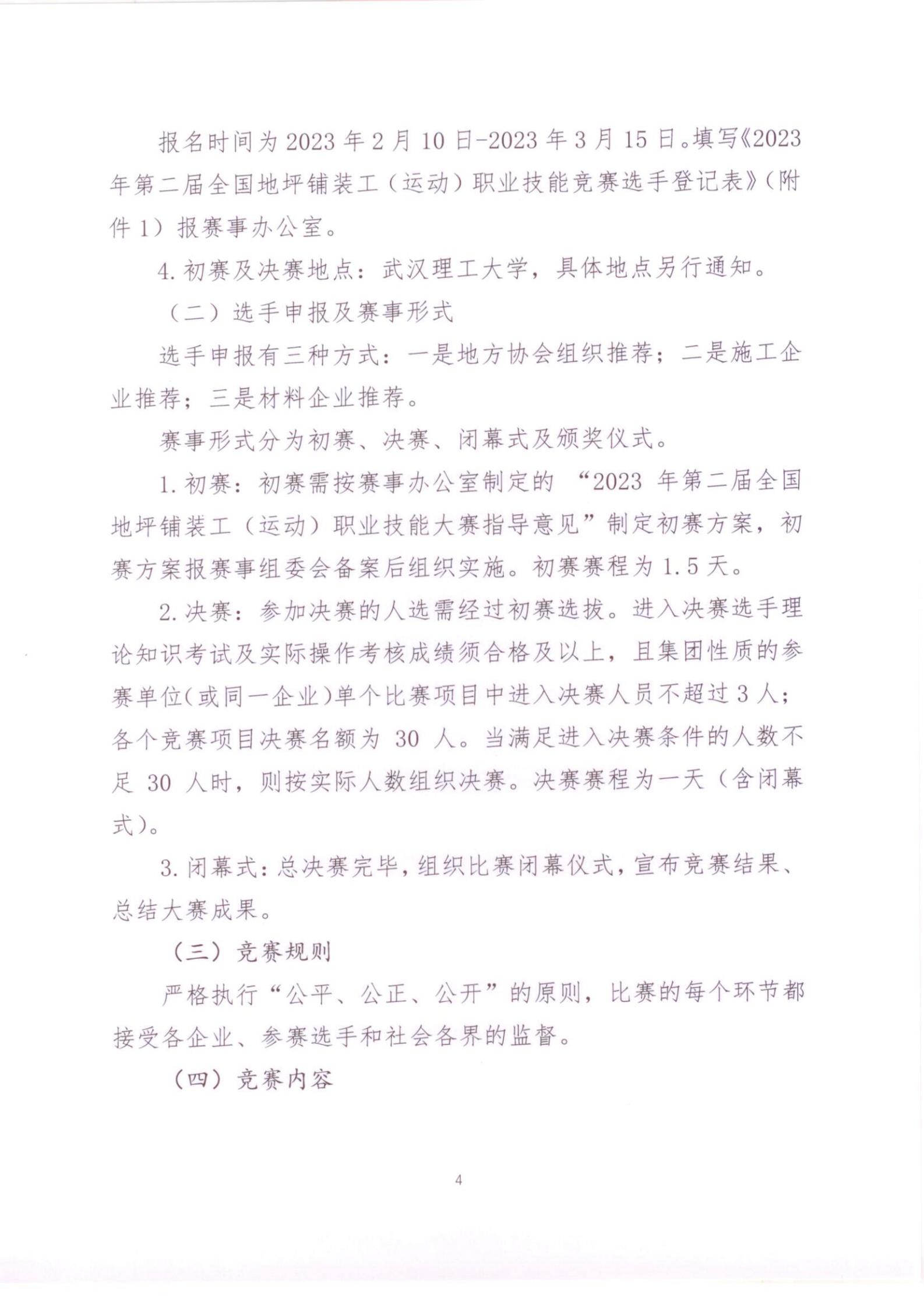 1.初赛:初赛需按赛事办公室制定的 “2023年第二届全国地坪铺装工(运动)职业技能大赛指导意见”制定初赛方案,初赛方案报赛事组委会备案后组织实施。初赛赛程为1.5天。