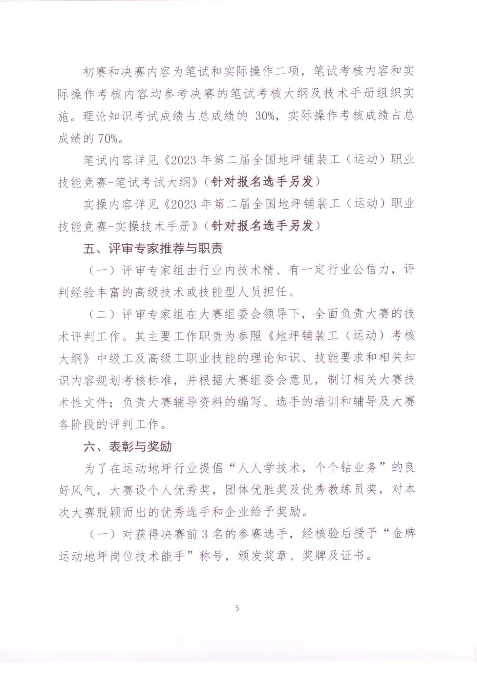 (二)评审专家组在大赛组委会领导下,全面负责大赛的技术评判工作。其主要工作职责为参照《地坪铺装工(运动)考核大纲》中级工及高级工职业技能的理论知识、技能要求和相关知识内容规划考核标准,并根据大赛组委会意见,制订相关大赛技术性文件;负责大赛辅导资料的编写、选手的培训和辅导及大赛各阶段的评判工作。