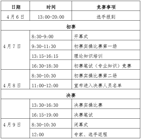 2.决赛:参加决赛的人选需经过初赛选拔。进入决赛选手理论知识考试及实际操作考核成绩须合格及以上,且集团性质的参赛单位(或同一企业)单个比赛项目中进入决赛人员不超过3人;各个竞赛项目决赛名额为30人。当满足进入决赛条件的人数不足30人时,则按实际人数组织决赛。决赛赛程为一天(含闭幕式)。