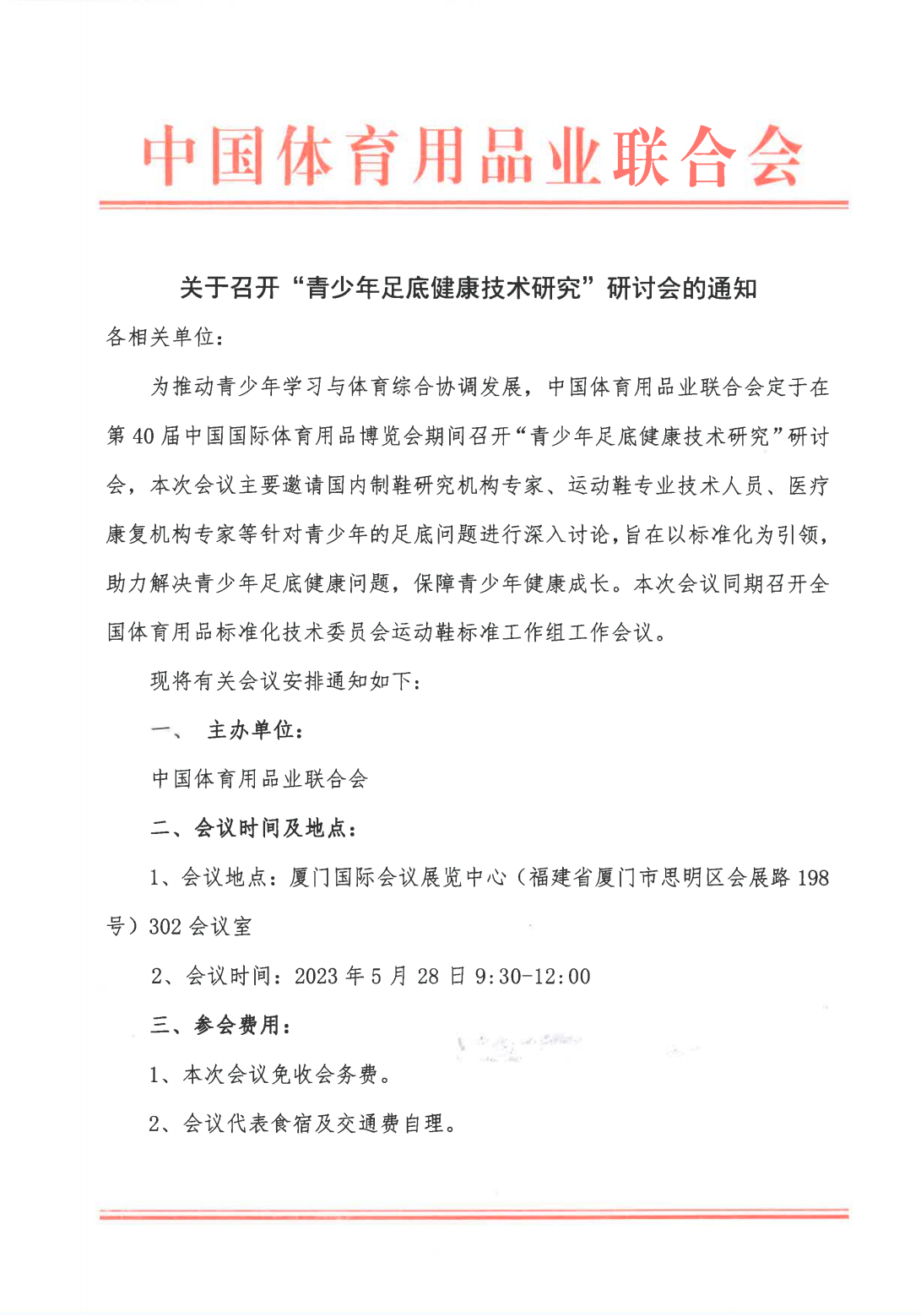 为推动青少年学习与体育综合协调发展,中国体育用品业联合会定于在第40届中国国际体育用品博览会期间召开“青少年足底健康技术研究”研讨会,本次会议主要邀请国内制鞋研究机构专家、运动鞋专业技术人员、医疗康复机构专家等针对青少年的足底问题进行深入讨论,旨在以标准化为引领,助力解决青少年足底健康问题,保障青少年健康成长。本次会议同期召开全国体育用品标准化技术委员会运动鞋标准工作组工作会议。