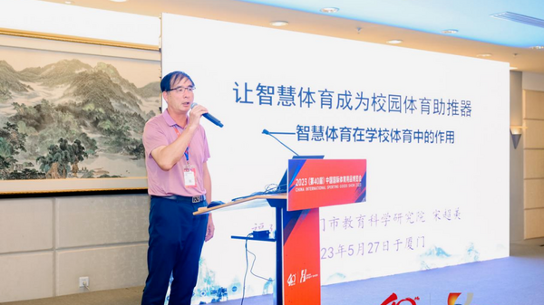 全国中小学教指委委员、厦门市特级教师宋超美在交流大会作《让智慧体育做校园体育助推器》的专题报告