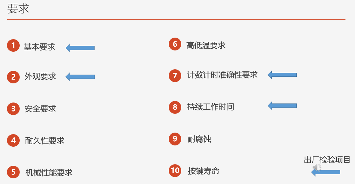 该标准从基本要求、外观要求、安全要求、耐久性要求、机械性能要求、高低温要求、计数计时准确性要求、持续工作时间、耐腐蚀、按键寿命这10方面进行技术要求规范。其中,基本要求、外观要求、计数计时准确性要求、持续工作时间为4项出厂检验项目。