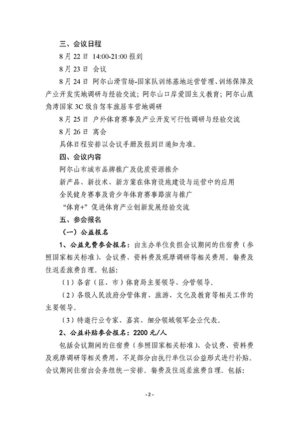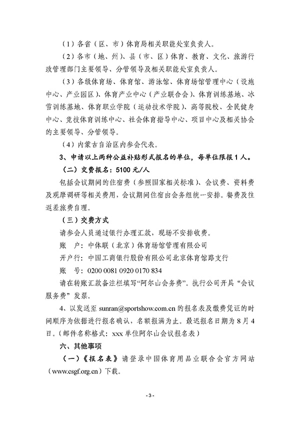 sunran@sportshow.com.cn的报名表及缴费凭证的时间顺序为依据进行报名确认,名额报满为止。最迟报名日期为8月4日。(邮件名称格式:xxx单位阿尔山会议报名表)