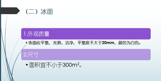 值得各生产企业注意的是,针对移动真冰场的核心部分,该标准对冰面做出了具体要求。冰面的外观表面应平整、光滑、洁净,平整度不大于20mm,颜色为白色,整体冰面面积不宜小于300㎡。