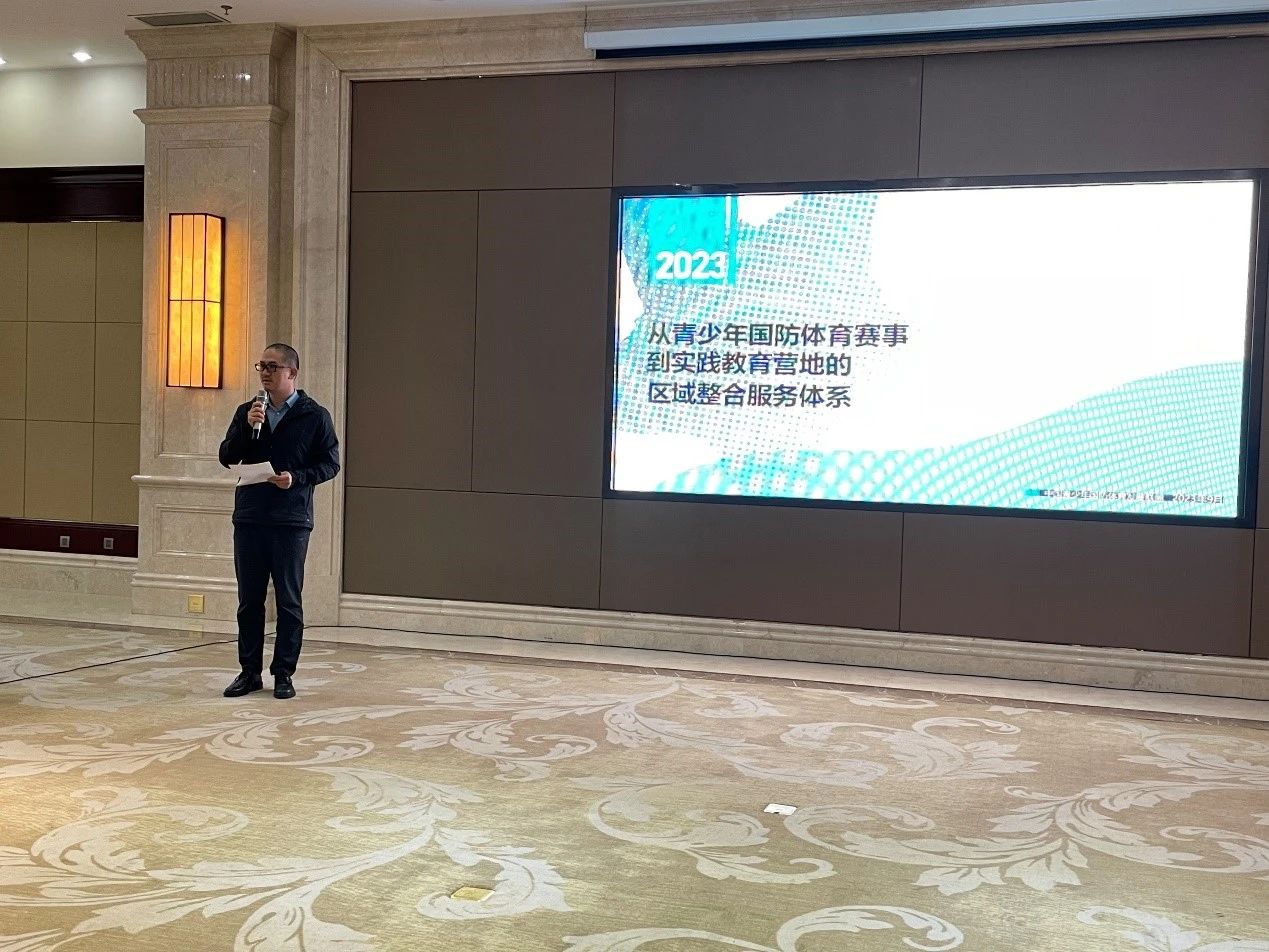 本次会议的联合主办单位中国青少年国防体育发展联盟副秘书长陈磊为大家做了《从青少年国防体育赛事到实践教育营地的区域整合服务体系》专题演讲。