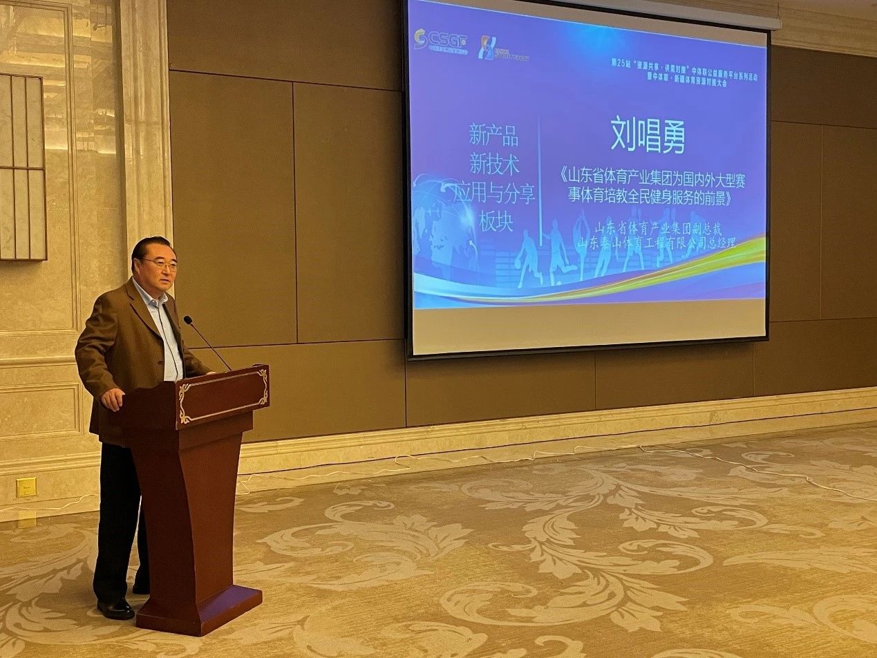 泰山体育为本届杭州亚运会12个大项、17个分项的比赛提供器材和8项赛事服务。会上,山东省体育产业集团副总裁、山东泰山体育工程有限公司总经理刘唱勇以《山东省体育产业集团为国内外大型赛事体育培教全民健身服务的前景》为主题与大家进行了交流。