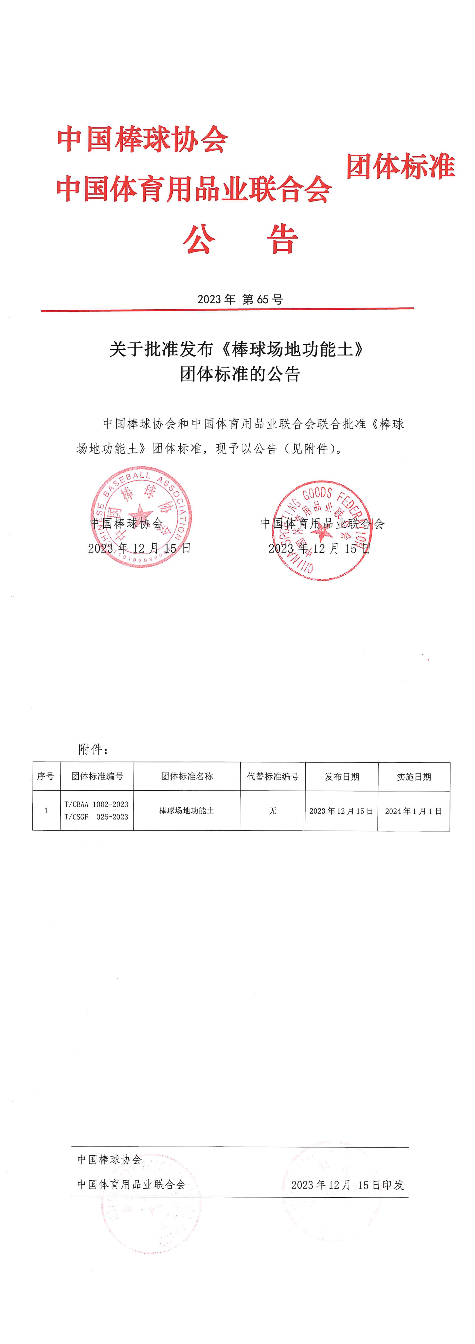 中国棒球协会和中国体育用品业联合会联合批准《棒球场地功能土》团体标准,现予以公告(见附件)。