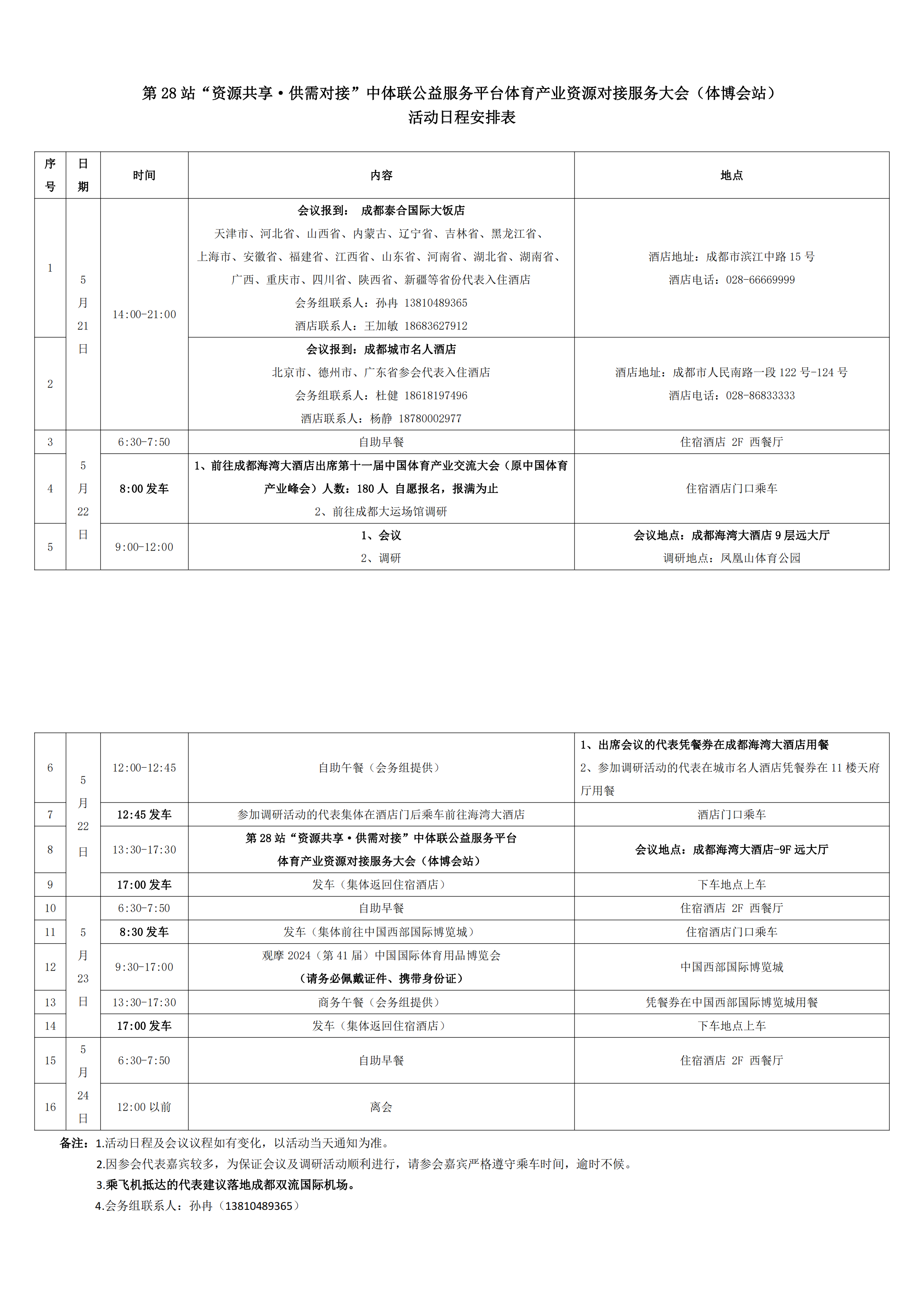 由中国体育用品业联合会主办,中国体育用品业联合会场馆事业工作委员会、场馆事业专家工作委员会承办,中体联(北京)体育场馆管理有限公司负责执行的第28站“‘资源共享·供需对接’中体联公益服务平台体育产业资源对接服务大会(体博会站)”将于5月21-24日第41届中国国际体育用品博览会期间在成都市举办。