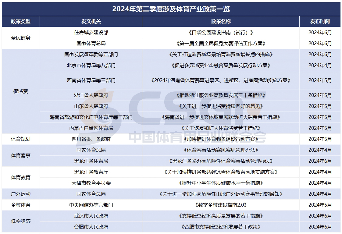 下面,联合会将从全民健身、促消费、体育规划、体育赛事、体育教育、户外运动、乡村体育、低空经济等关键词,盘点2024Q2的体育产业新政,帮助从业者把握新形势。