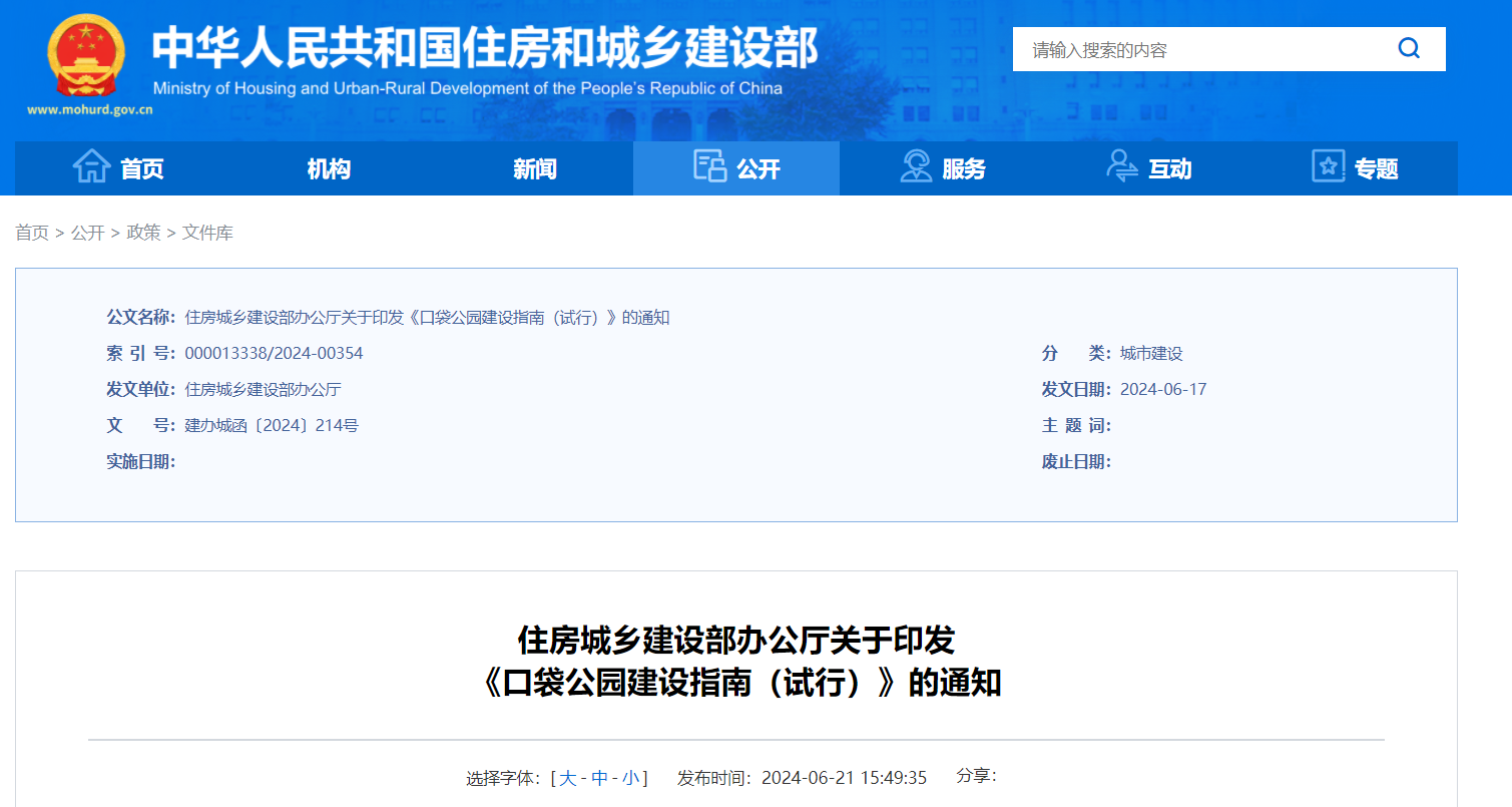为科学推进口袋公园建设、完善配套服务功能、提升维护管理水平,住房城乡建设部印发《口袋公园建设指南(试行)》,适用于城市内口袋公园规划、设计、建设和管理工作,供各地结合实际参照执行。