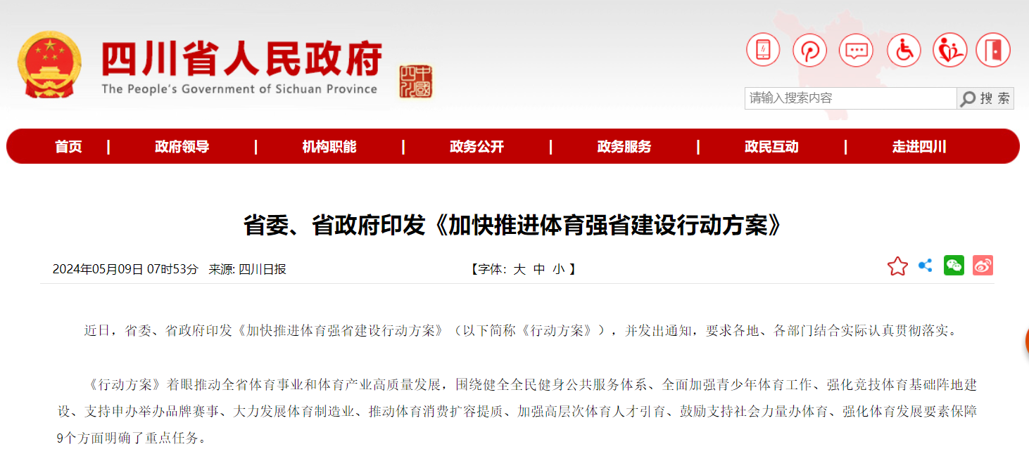 四川省委、省政府印发《加快推进体育强省建设行动方案》,围绕健全全民健身公共服务体系、全面加强青少年体育工作、强化竞技体育基础阵地建设、支持申办举办品牌赛事、大力发展体育制造业、推动体育消费扩容提质、加强高层次体育人才引育、鼓励支持社会力量办体育、强化体育发展要素保障9个方面明确了重点任务。