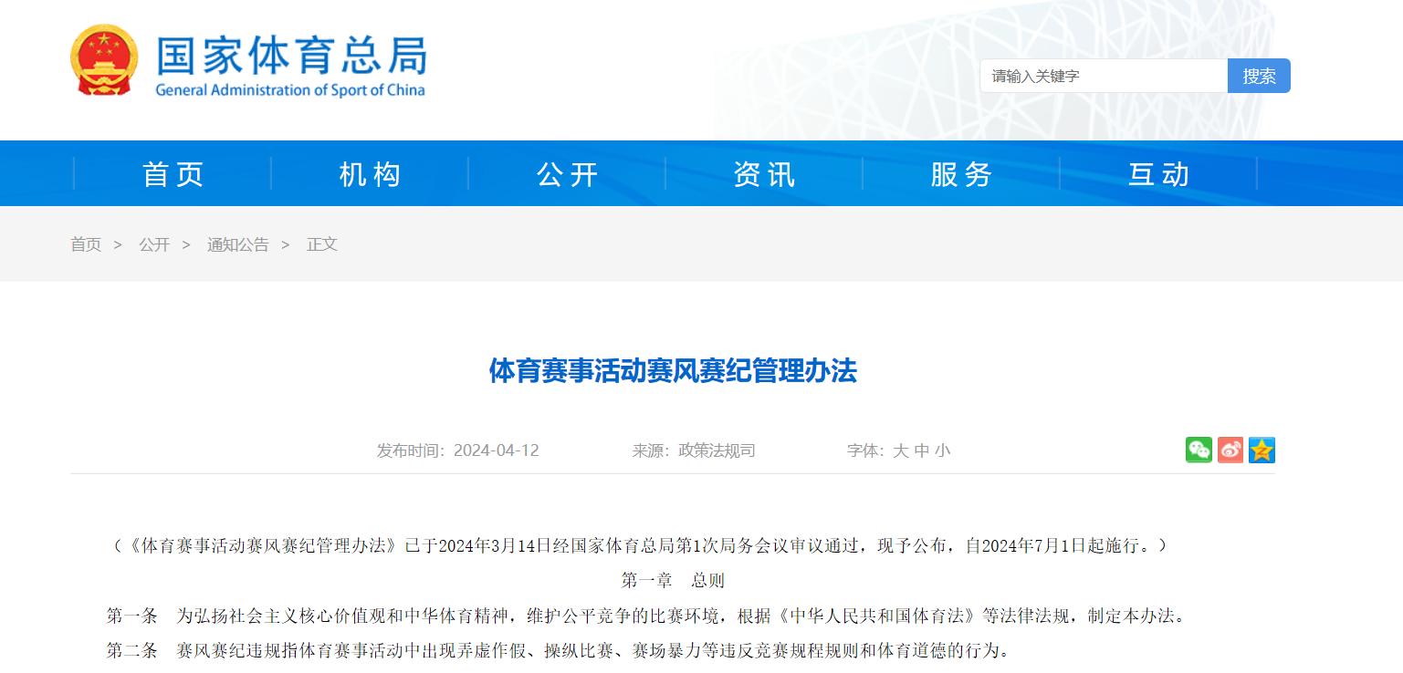 国家体育总局发布《体育赛事活动赛风赛纪管理办法》,自2024年7月1日起施行。