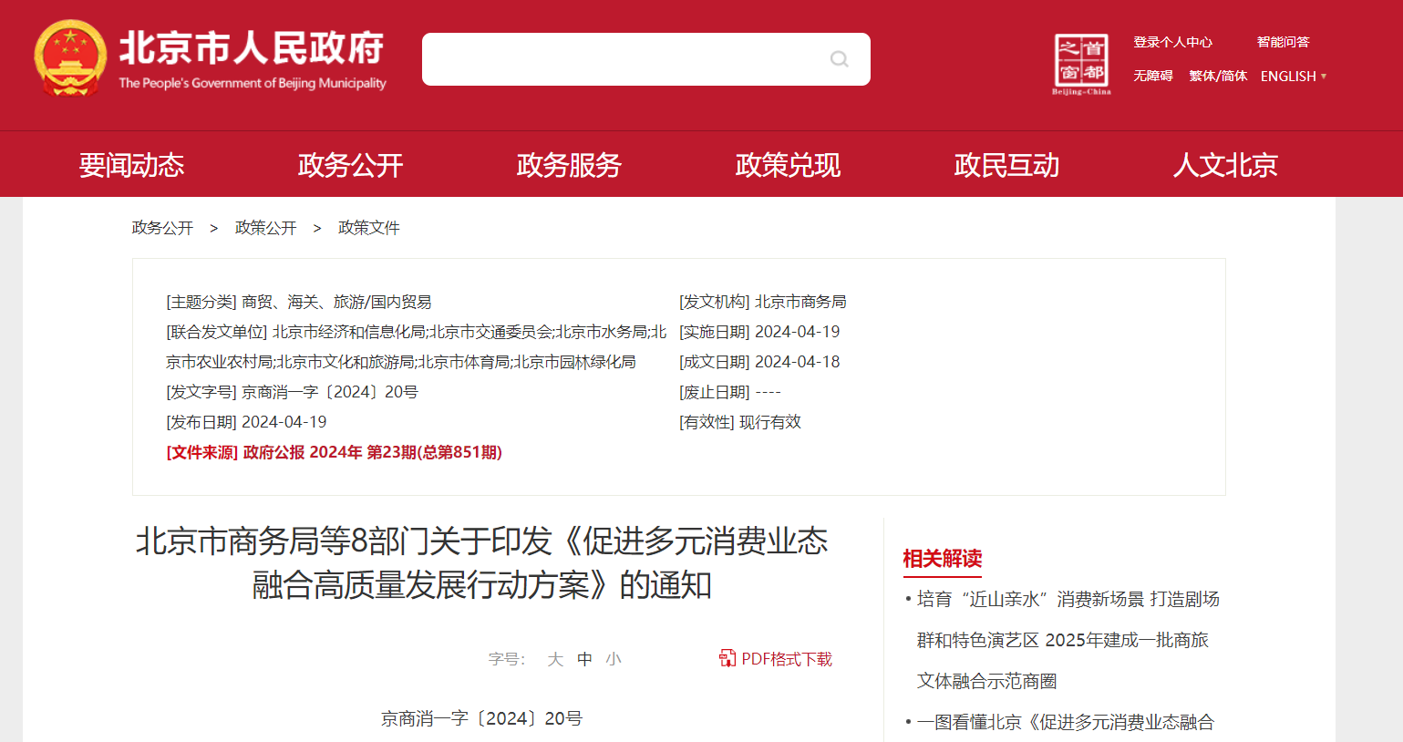 北京市体育局等八部门《促进多元消费业态融合高质量发展行动方案》