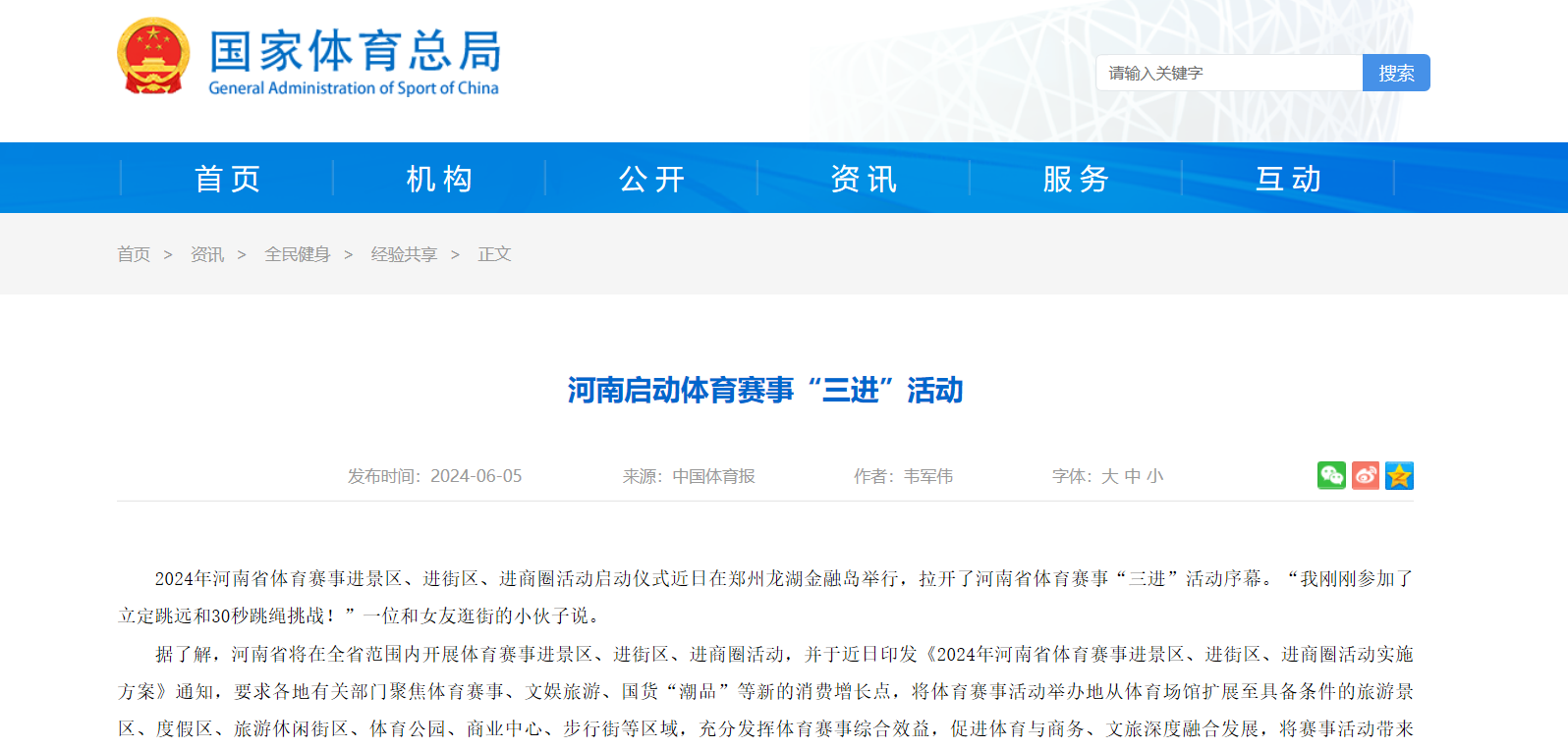 河南省三部门联合印发《2024年河南省体育赛事进景区、进街区、进商圈活动实施方案》。