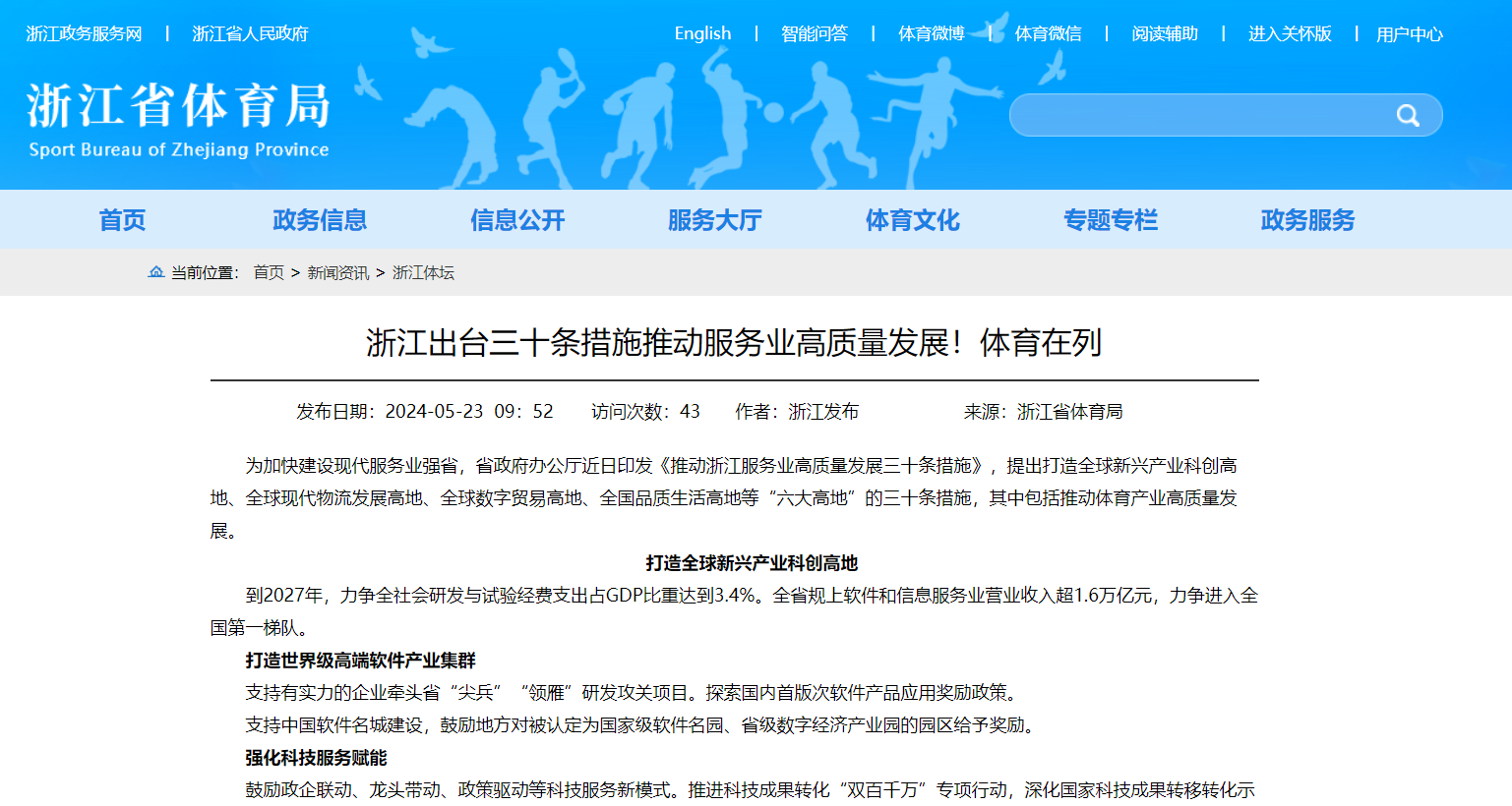 浙江省政府办公厅印发《推动浙江服务业高质量发展三十条措施》,明确打造全球新兴产业科创高地、全球现代物流发展高地、全球数字贸易高地、全国品质生活高地等“六大高地”的三十条措施。涉及体育相关内容如下: