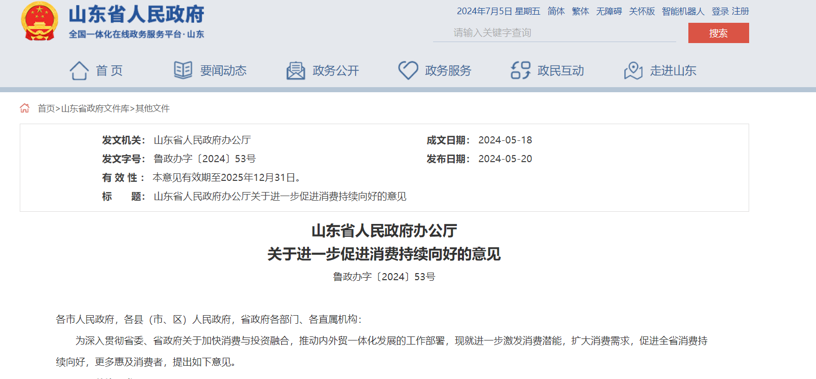 山东省人民政府办公厅发布《关于进一步促进消费持续向好的意见》,包括全力推动消费品以旧换新,提升文旅、冰雪消费,深挖银发、年轻一代消费等20条。