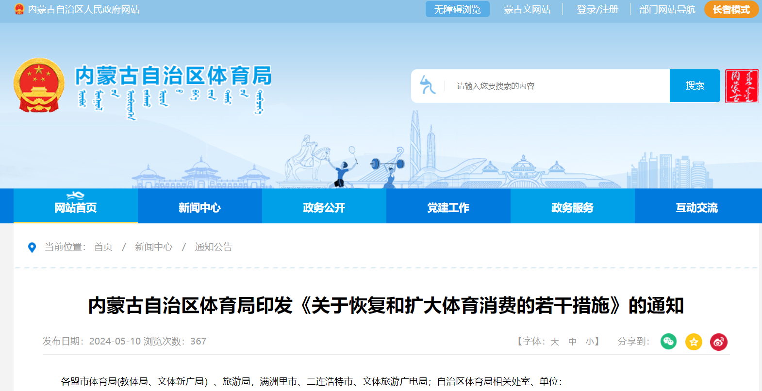内蒙古自治区体育局印发《关于恢复和扩大体育消费的若干措施》,涵盖推动相关政策落地实施、积极申办高水平全国赛事等16条具体措施。