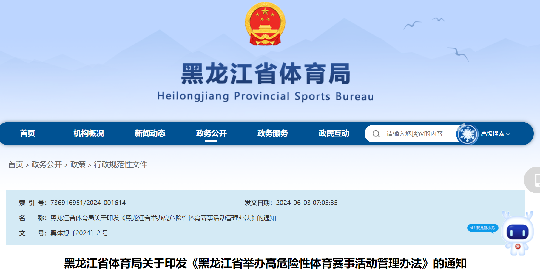 《黑龙江省举办高危险性体育赛事活动管理办法》经省体育局第九次局党组会审议通过后正式印发,该办法于2024年6月15日起施行。