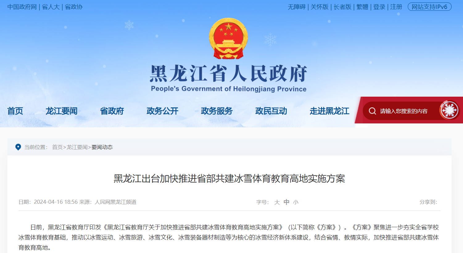 黑龙江省教育厅印发《黑龙江省教育厅关于加快推进省部共建冰雪体育教育高地实施方案》,旨在进一步夯实全省学校冰雪体育教育基础,发挥教育服务功能,加快推进省部共建冰雪体育教育高地。