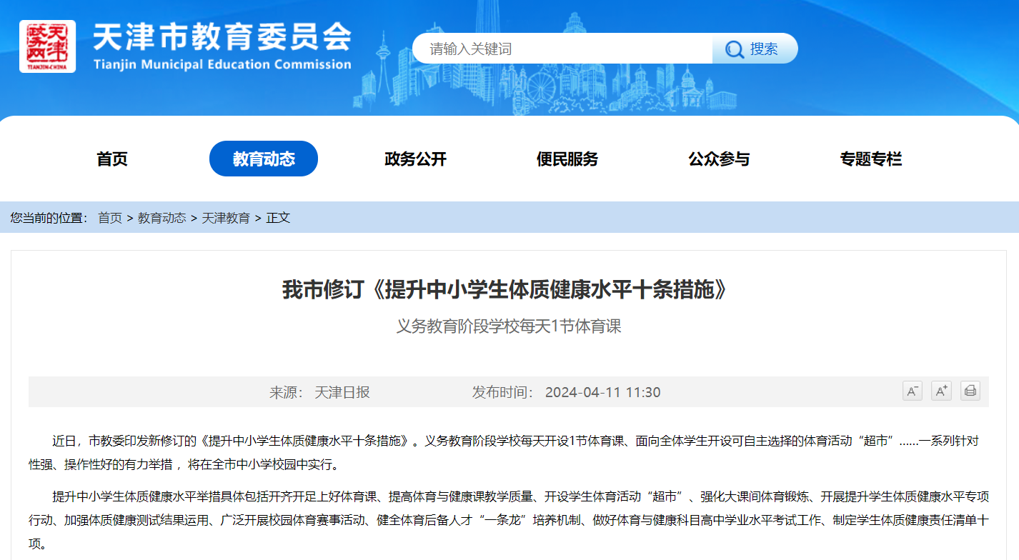 天津市教育委员会《提升中小学生体质健康水平十条措施》