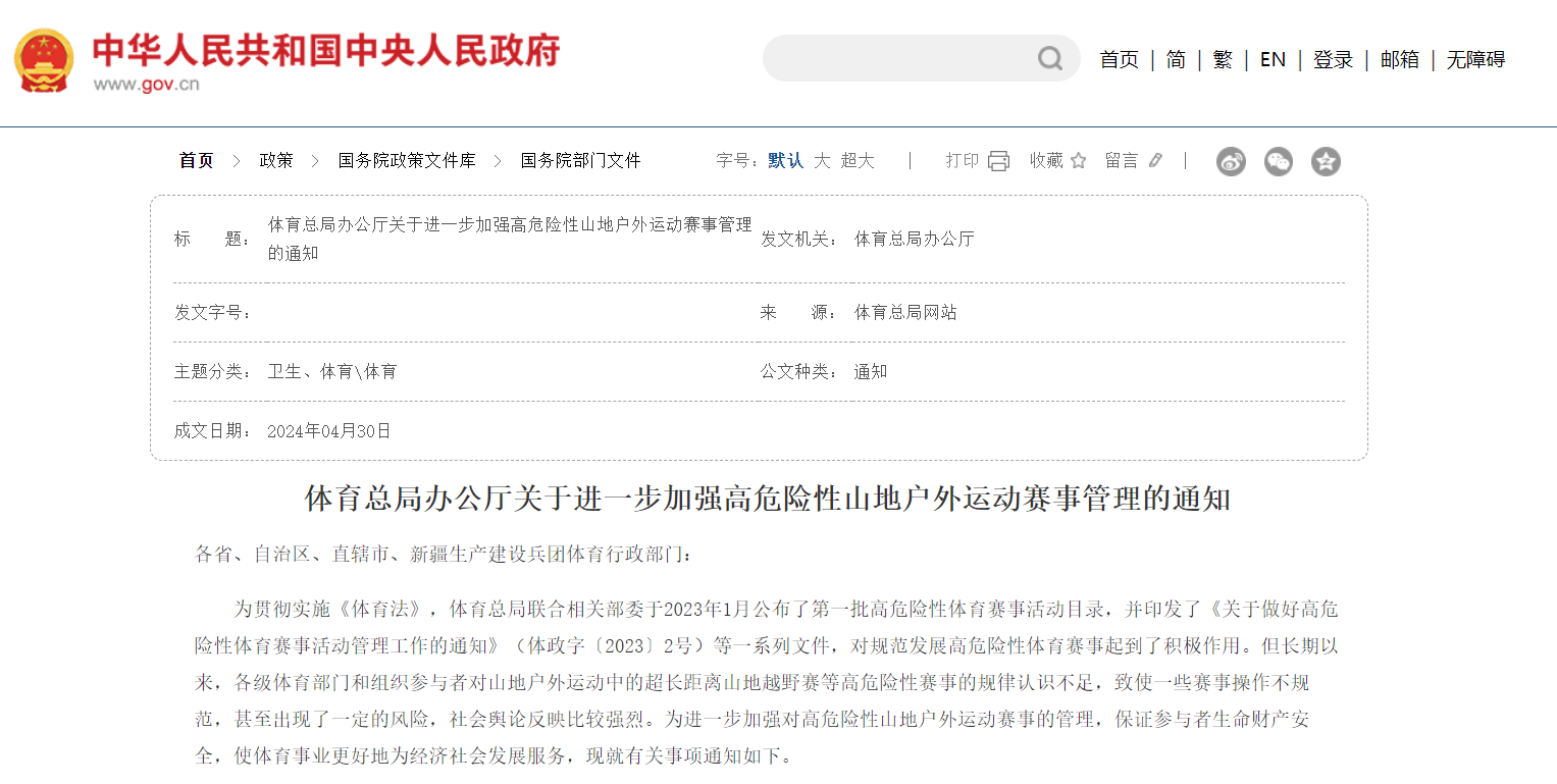 《关于进一步加强高危险性山地户外运动赛事管理的通知》