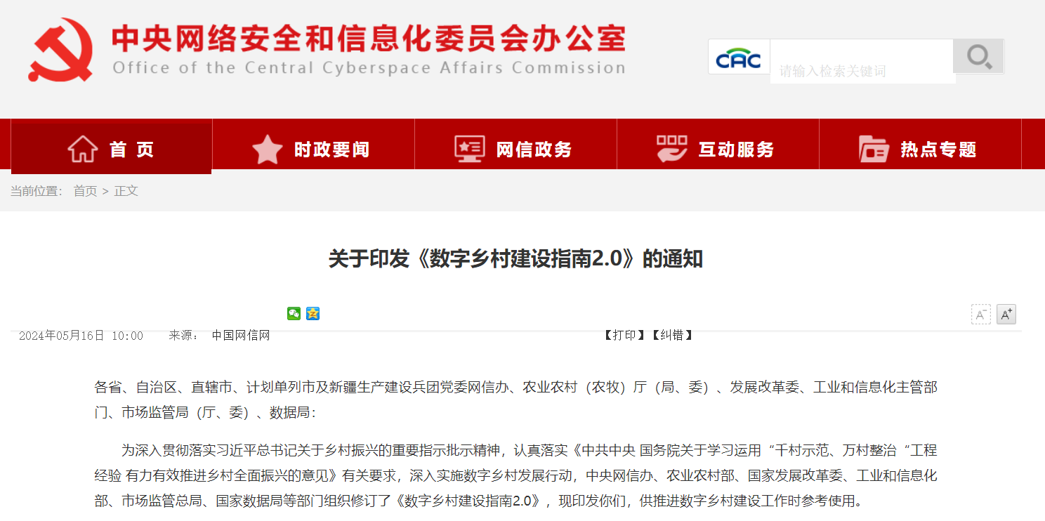 中央网信办秘书局、农业农村部办公厅、国家发展改革委办公厅、工业和信息化部办公厅、市场监管总局办公厅、国家数据局综合司联合印发《数字乡村建设指南2.0》。