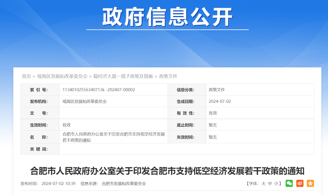 《合肥市支持低空经济发展若干政策》正式印发,对企业落户、商业航线开通、基础设施建设等10个方面提出激励举措,目标建成具有国际影响力的“低空之城”。支持企业探索低空经济相关新业态、新模式,在场景开放、宣传推广上给予支持,加快推进商业化落地进程。对获国家体育总局航管中心、中国航空运动协会授牌的低空飞行营地,给予30万元一次性奖励。