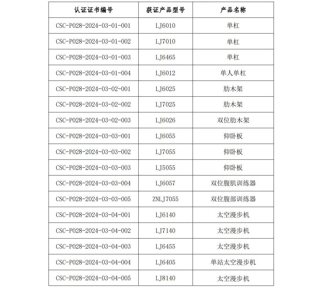 青岛英派斯健康科技股份有限公司获得由中体联(北京)认证服务有限公司颁发的室外健身器材、笼式运动器材、足球门、羽毛球柱产品认证证书,证书明细如下:(共196张)。特此公告。