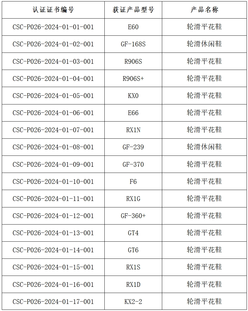 宁波金峰文体器材有限公司获得由中体联(北京)认证服务有限公司颁发的轮滑鞋器材、滑板器材产品认证证书,证书明细如下:(共35张)。特此公告。