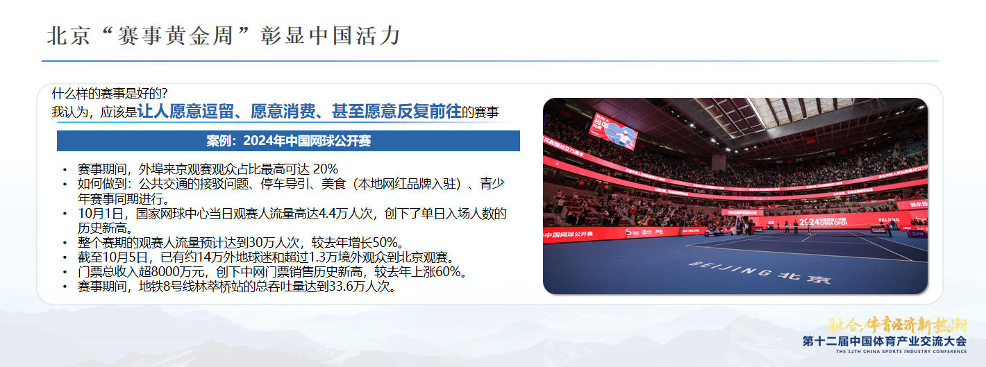 赛事经济持续加速,“赛事+”通过横向融合多元消费场景提振消费。“体育赛事进景区、进街区、进商圈”“乐享精彩赛事 寻味中华美食”等活动的举办,全面推进体文旅商展多业态融合。对此新华社体育部主任余孝忠特别分享2024中国网球公开赛案例,“中网的总门票收入超过8000万元,创下中网门票销售历史新高,同比上涨60%。整个中网园区就是一个公园,不仅比赛场馆坐满观众,场外的草坪上、训练场上也都是观众。在园区内实现逛、吃、游、购、娱。‘去中网看球’成为社交媒体时髦热点。”中国体博会同样成为赛事经济绽放魅力的平台,例如连续三年举办的北京体育产业招商推介会,以及展览面积持续扩大的政府体育事业专区,既能看到从“村超”“村BA”开始、迭代升级“到贵州看比赛”的贵州,也有聚焦户外运动能的云南和打造“三城两都一市”的成都。各地着力打造赛事 “金名片”,把赛事作为推动本地区经济社会发展的重要平台,在稳定经济增长、促进扩大消费、提升城市形象、助力乡村振兴等方面成效显著。