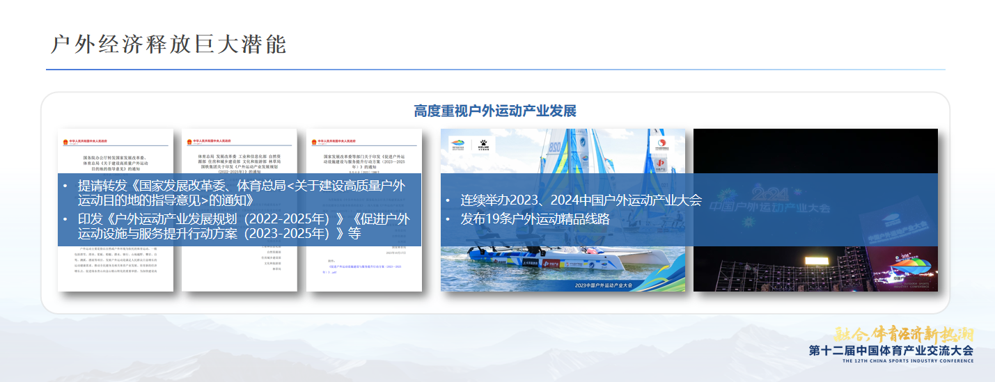 “十四五”以来,体育产业融合成效显著,已成为推动体育经济发展的引擎。对此,国家体育总局体育经济司司长杨雪鸫在本届大会上高度概括四方面融合发展成效:“一是赛事经济实现蓬勃发展。二是户外经济释放巨大潜能。三是体育用品加速转型升级。四是体育消费持续激发活力。”