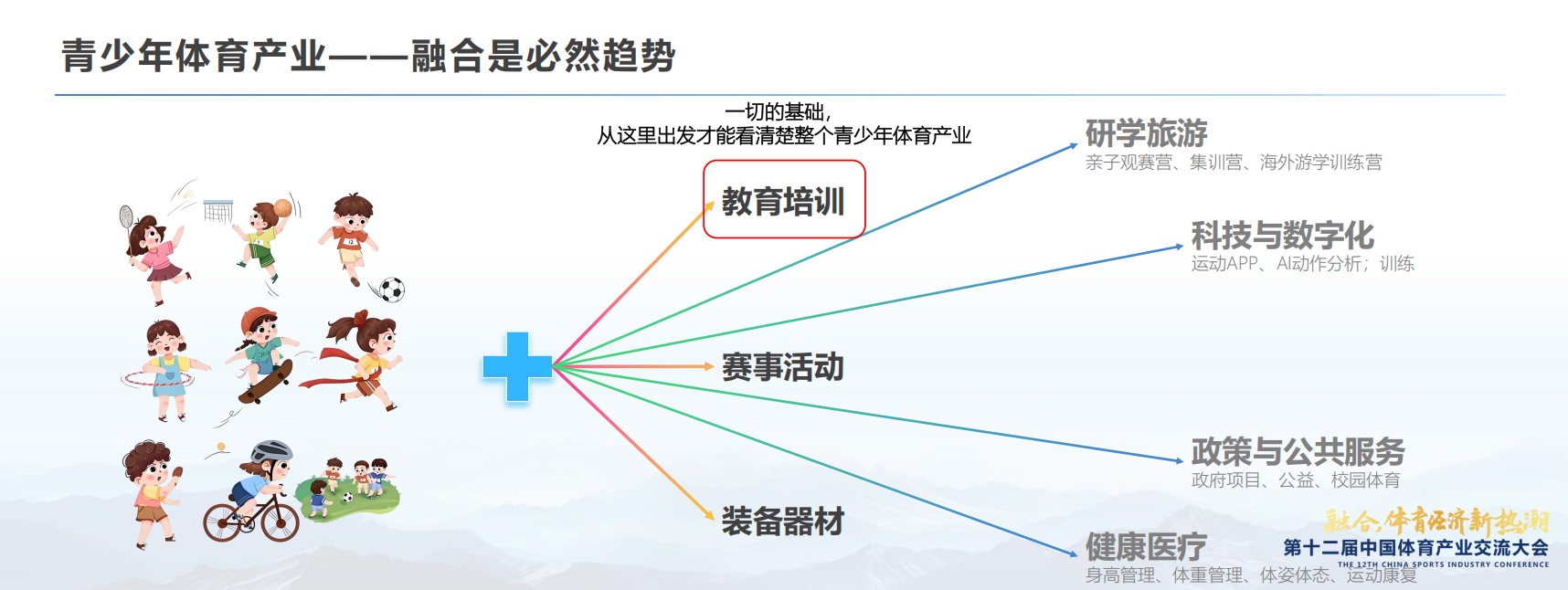 2014年国发46号文《关于加快发展体育产业促进体育消费的若干意见》,这个体育产业发展的标志性文件,特别提到“促进融合发展”。由此开始,“体育+”成为体育领域高频词。而过往十年,我们见证“体育+”从简单概念整合或者简单加法,到深度体文旅商深度融合的全面发展。如今,体育逐渐走在经济社会中心位置,融合发展同样加速成为体育产业的发展引擎。