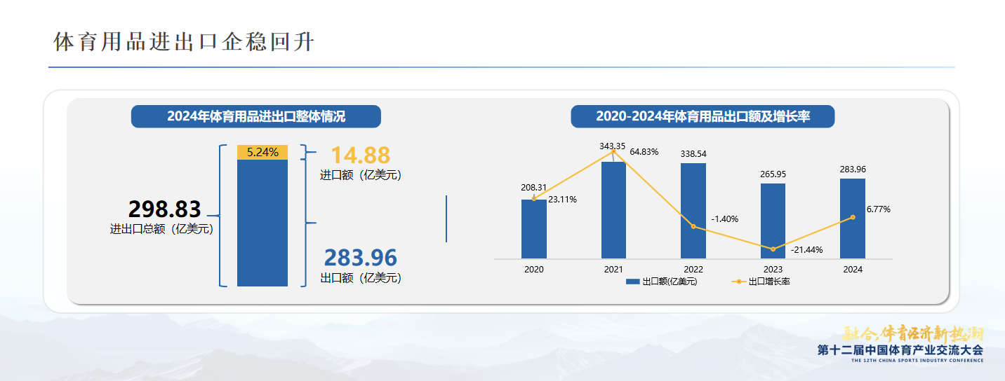 进出口方面,2024年体育用品进出口持续回升,总额达到298.83亿美元,特别是出口额恢复增长。值得注意的是,根据联合会相关研究,跨境电商正在从“卖货红利期”进入“品牌红利期”,将为体育用品带来万亿级的全球市场机会。根据本届中国体博会商贸对接区收集到的信息,境外vip买家的意向采购金额已超过9000万美元,展会期间,知名国际体育用品采购商数量已增至66家,海外买家累计进场人数超过4000人。由此从国际市场来看,体育用品产业的全球竞争力强劲。