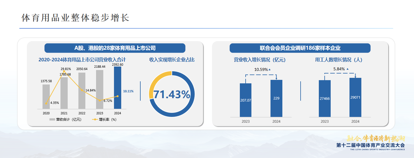 体育用品企业方面,A股、港股的28家体育用品上市公司,总计总体收入增幅达到10.11%,其中实现增长的企业占比为71.43%。根据联合会会员企业调研,186家样本企业的2024年营业收入达到229亿元,同比增长10.59%,用工人数增长5.84%,显示出行业发展的强劲动力。与之相应的,一方面是同样来自于报告的2024年体育用品业企业景气指数为143.8,预期企业景气指数显著高于即期企业景气指数,行业总体对行业发展前景展现乐观判断;另一方面,本届中国体博会上,1811家参展企业再创参展数量新高,现场观众突破12万人次,更是各方携手前行、共促体育用品高质量发展的坚定信心的最好体现。