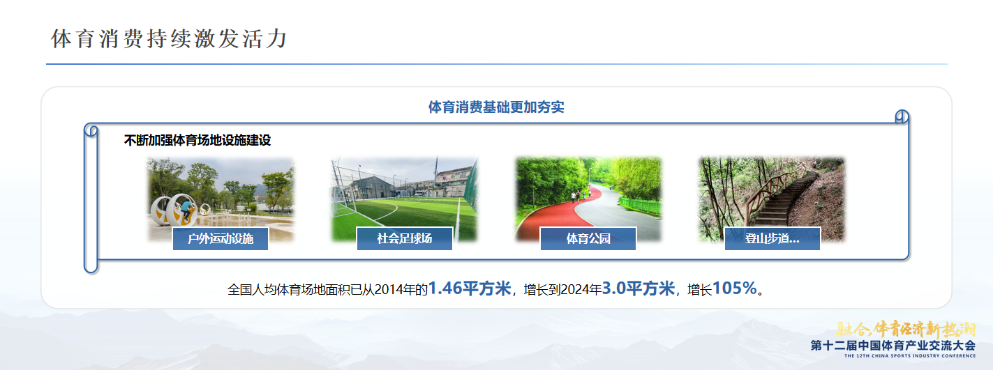 同时需要高度关注的是,体育消费基础更加夯实。特别国家体育总局会同国家发展改革委持续推进全民健身设施补短板工程,加快户外运动设施、社会足球场地、体育公园、登山步道等各类场地设施建设。杨雪鸫司长表示:“最新数据显示,全国人均体育场地面积已从2014年的1.46平方米,增长到2024年3.0平方米,增长105%。”