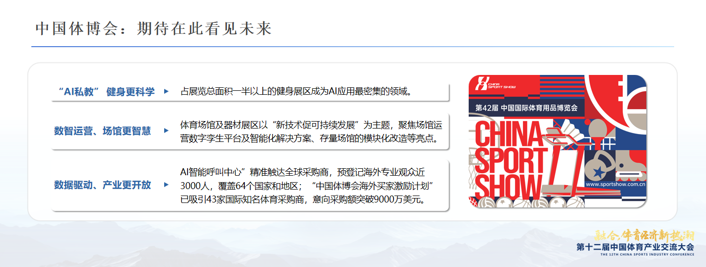 高志丹局长在2025年全国体育经济工作会上指出:“要积极实施‘体育+’战略,以融合发展为抓手,推动体育融入千行百业、赋能共同成长。”这也让第十二届中国体育产业交流大会的主题——“融合,体育经济新热潮”成为行业强音。无论是交流大会,还是第42届中国国际体育用品博览会,融合是热点,更是亮点,在体育产业成为国民经济支柱性产业之路,融合扮演的角色将越来越重要。