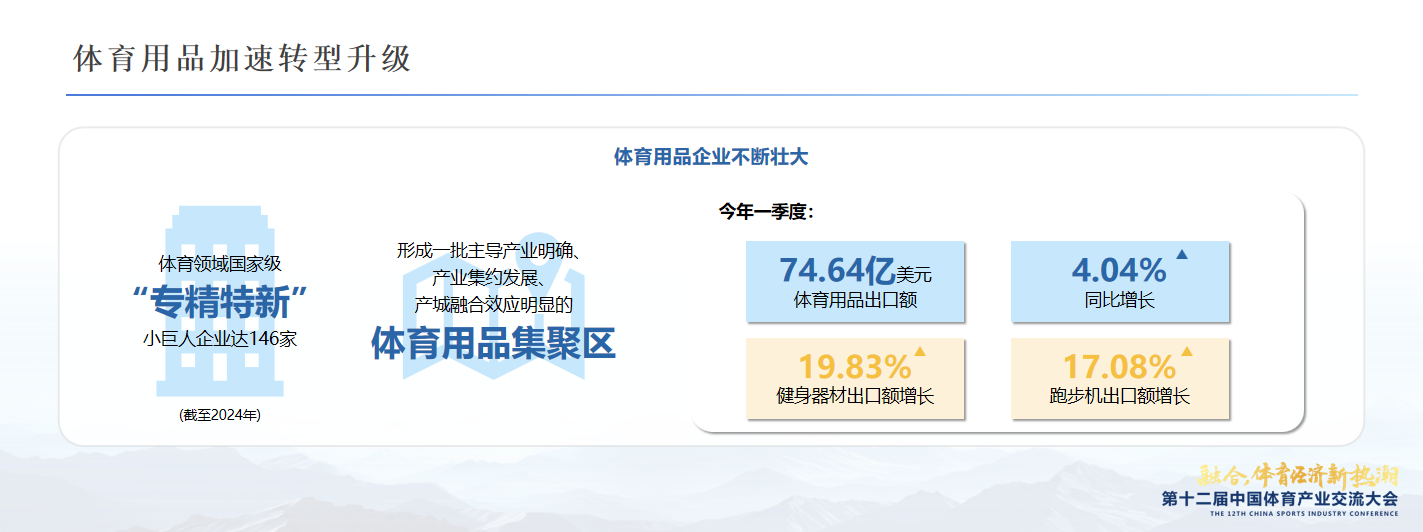 根据杨雪鸫司长在交流大会的分享:“截至2024年,体育领域国家级‘专精特新’小巨人企业达146家,体育用品已成为‘中国智造’的重要舞台。”