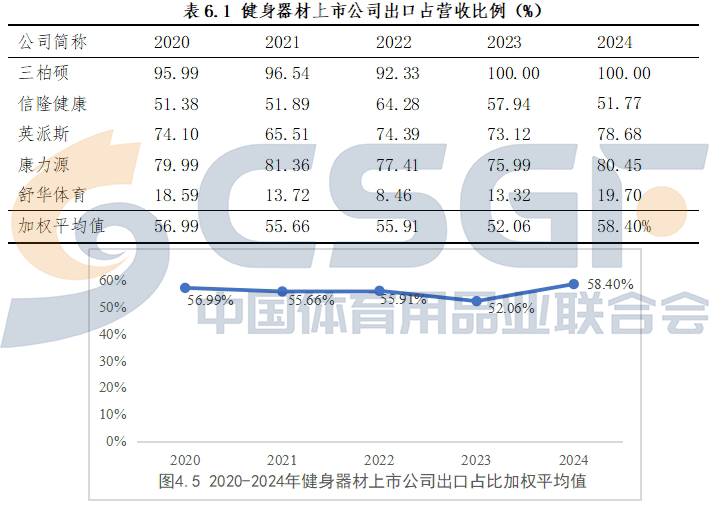 我国健身器材上市公司对国际市场依赖度较高,五家公司出口占营业收入比例的加权平均值长期保持在50%以上。按照公司财务报告数据,2024年,三柏硕产品全部出口国外市场,康力源、英派斯出口占比也分别高达80.459%、78.68%。而舒华体育则倚重国内市场,2024年出口占比为19.70%。