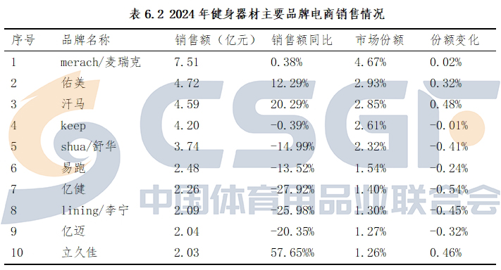 国产品牌在健身器材市场竞争中整体表现突出,麦瑞克、舒华、亿健、佑美、keep等品牌近几年稳居电商销售榜前列。2024年,麦瑞克电商渠道表现突出,以7.51亿元销售额位列榜首,市场份额达到4.67%,连续三年排名第一。其他品牌中,佑美、汗马、keep、舒华分别以4.72亿元、4.59亿元、4.2亿元、3.74亿元的销售额排名2-5位。