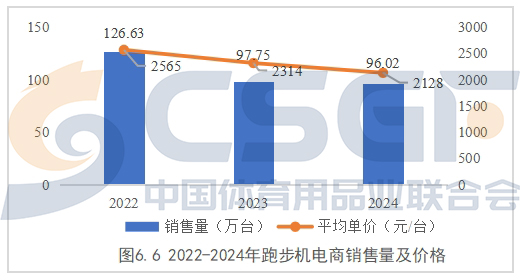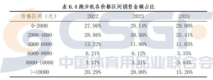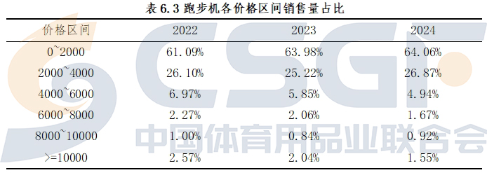 总体上看,近三年,跑步机电商销售整体表现为销售价格区间下移的特征。从低价位区间看,2024年,价格在2000元以下的跑步机销售量占到全部销售量的比例为64.06%,而这一比例在2023年和2022年分别为63.98%、61.09%。2000-4000元价格区间跑步机销售量占比保持相对稳定,4000元以上中高价位跑步机销售量占比明显下降。